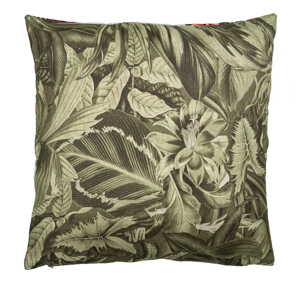 Two extraordinarily life-like pandas surrounded by exotic foliage come forth in this stunning printed linen cushion by Vito Nesta. The rich detail and deep colors of the animal and plant kingdoms create a striking effect against the delicate green linen background, making this a remarkable decorative pillow for any interior.