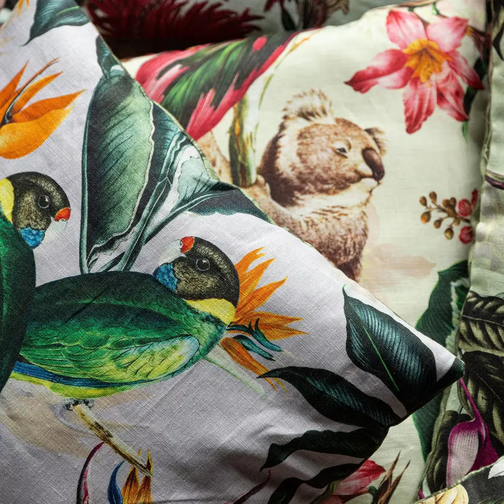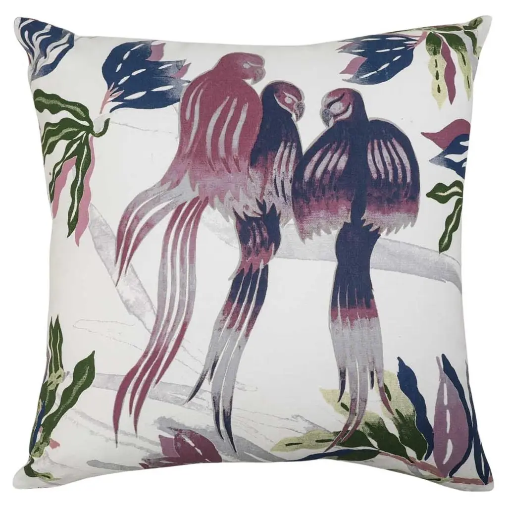 Part of the Animalia series from Vito Nesta's signature Grand Tour Collection, this vibrant yet delicate piece is an elegant throw pillow which will enrich any living space. Printed on linen, it features two exquisitely depicted parrots nestled against colorful tropical foliage, creating a luscious palette of colors and textures against a white backdrop.