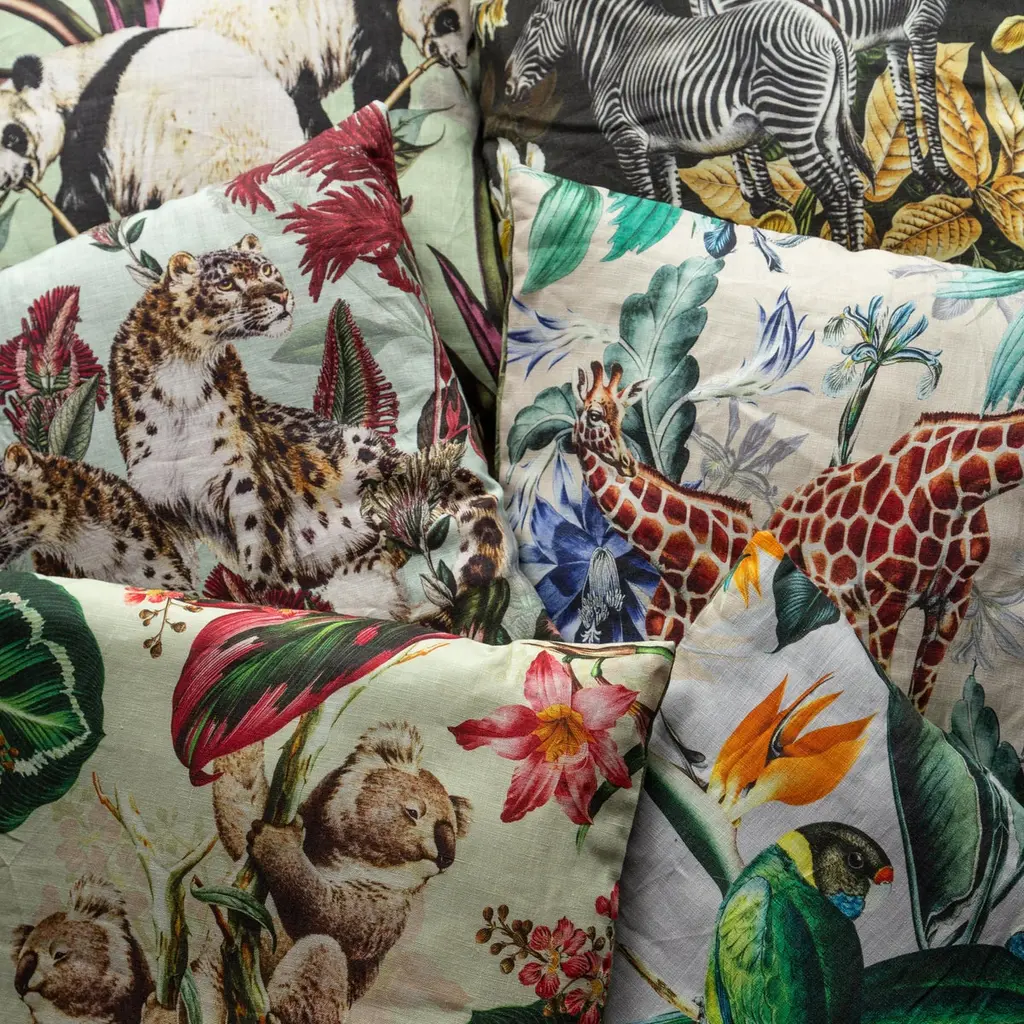 Animalia pillows is a set of cushions that tells the story of wild animals looking for love in spring time. Each pillow features two animals of the same species set in an explosion of flowers and vegetation. On the backside of the cushion there's a green composition of vegetation.Pandas pillow.