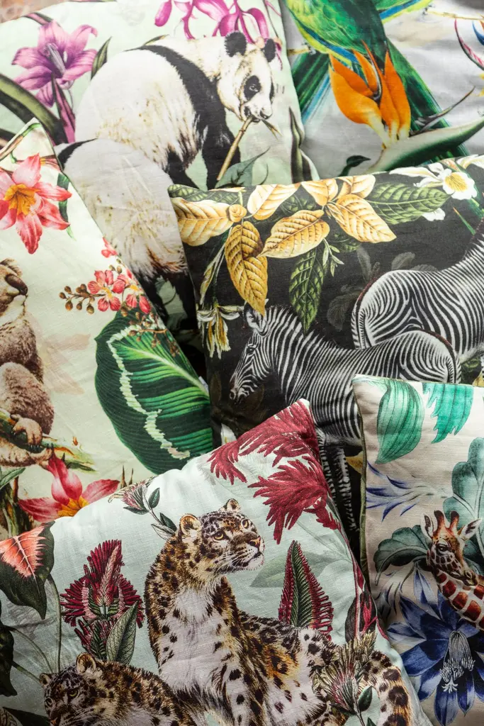 Animalia pillows is a set of cushions that tells the story of wild animals looking for love in spring time. Each pillow features two animals of the same species set in an explosion of flowers and vegetation. On the backside of the cushion there's a green composition of vegetation.All set.