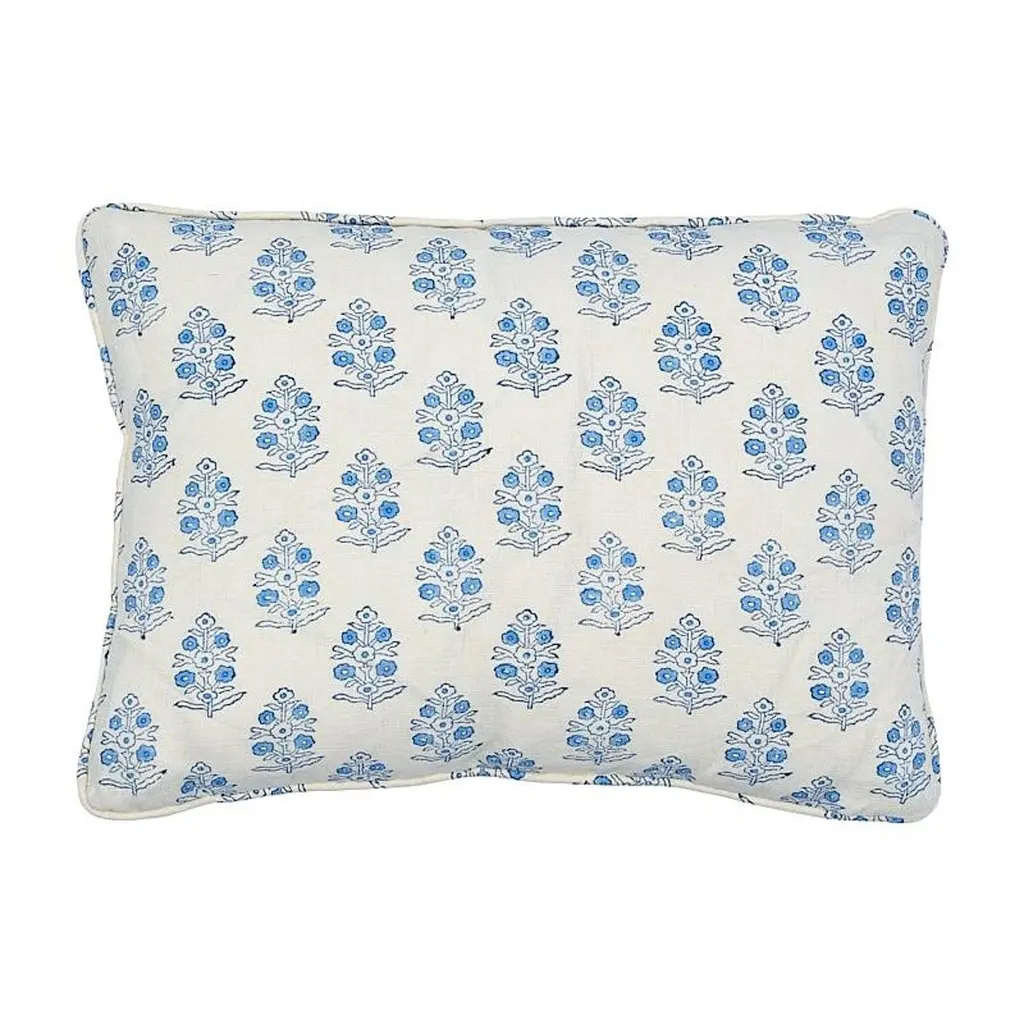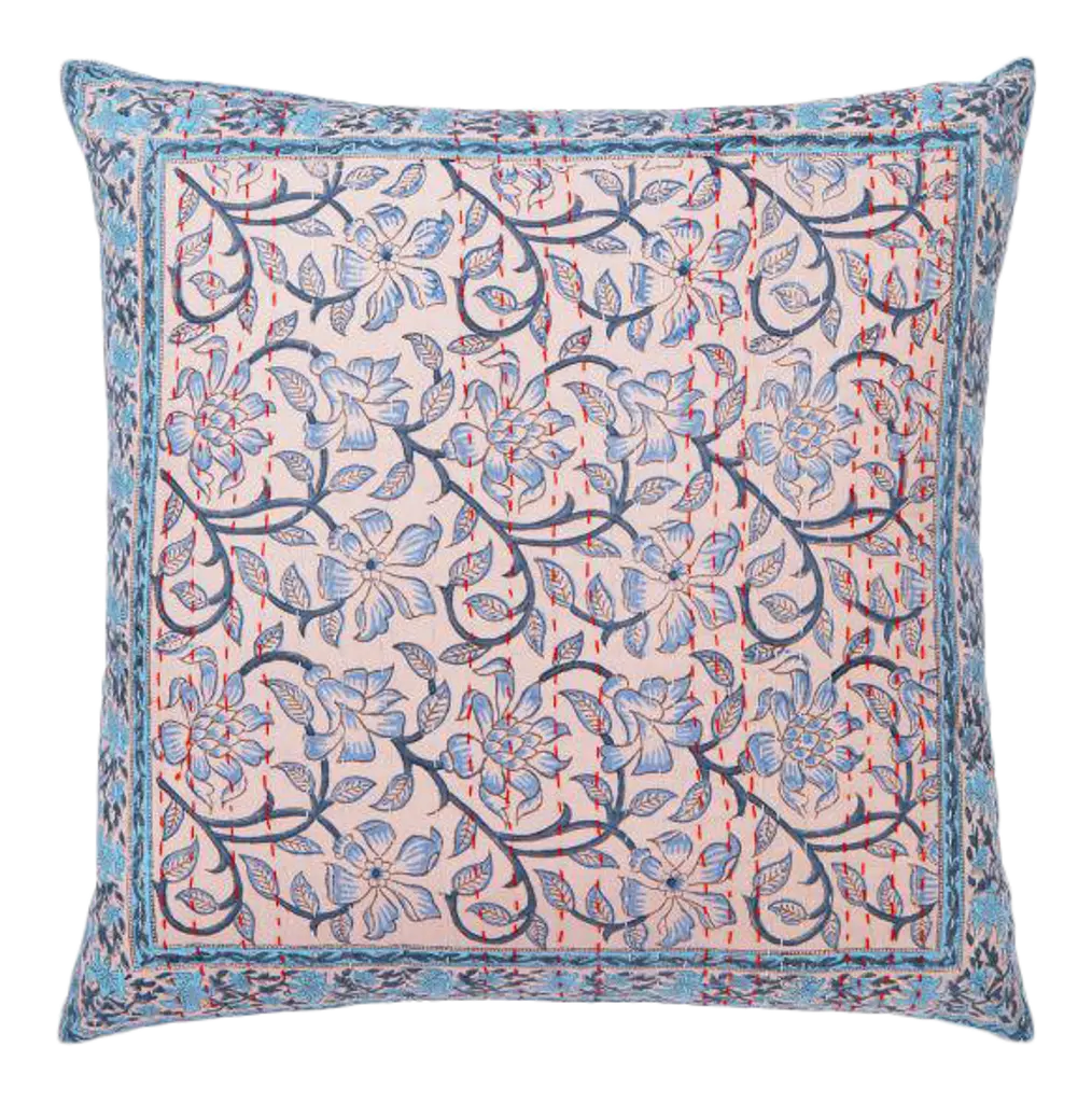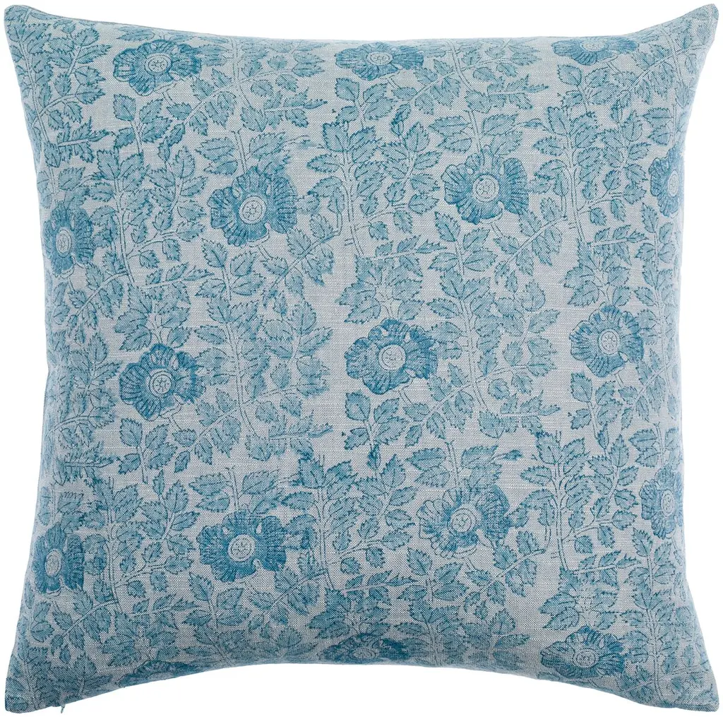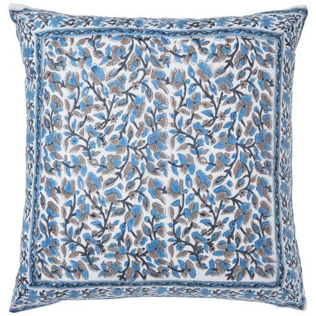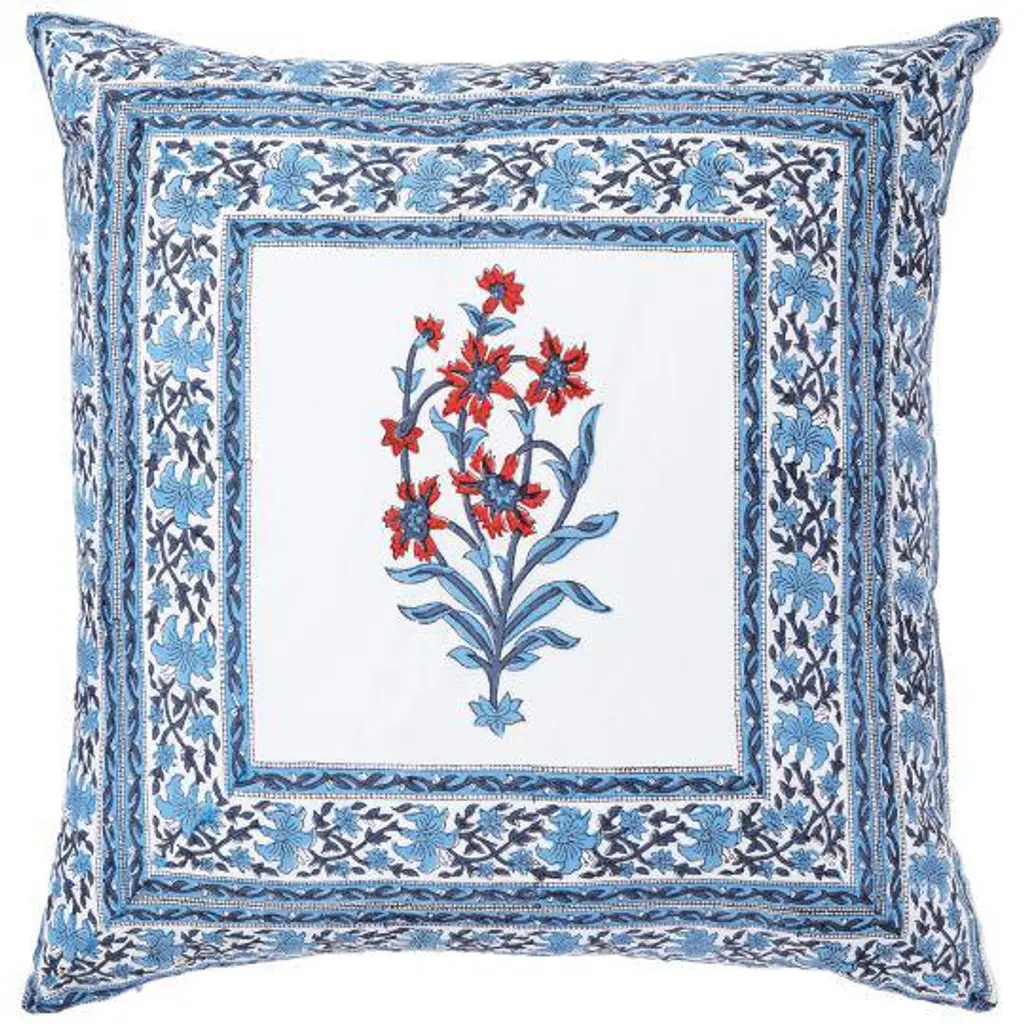 The Anna-Nargis design combines an all-over Anna floral pattern with European influences in blue and gray on one side, with Nargis, a stylized narcissus flower motif with Persian influences in a bright orange and blue color palette on the reverse. The design is part of the Aizel Collection that offers an assortment of soft yet vibrant floral prints, combining classic Indian and European influenced styles for a fabulous global aesthetic. Ancient printing techniques and delightful traditional designs printed on crisp 300-thread count cotton. make our Indian block print pillow covers one of a kind. The hand-crafted nature of these fabrics gives rise to charming imperfections, highlighting the skill and artistry that go into making them. Add a subtle splash of color to a room, or bury your sofa and bed in an eclectic blend of patterns and hues with these chic Indian style pillow covers. Materials: 300-thread count cotton. Product Features: Finished with a zipper closure on the edge for easy reversibility. Decorative Pillowcase/Pillow Case - cover only. Insert not included. Crafts: Hand block printing. DIMENSIONS Pillow Cover: 18" x 18" square CARE & MAINTENANCE Protect from direct sunlight when using. Hand or machine wash separately in cold water on gentle cycle. Use a mild detergent without any bleach or fabric softeners. Do not soak or wring the fabrics. Scrub gently if needed. Tumble dry on low heat or air dry in the shade. Iron at medium setting. Test stain remover on a small area before applying.
