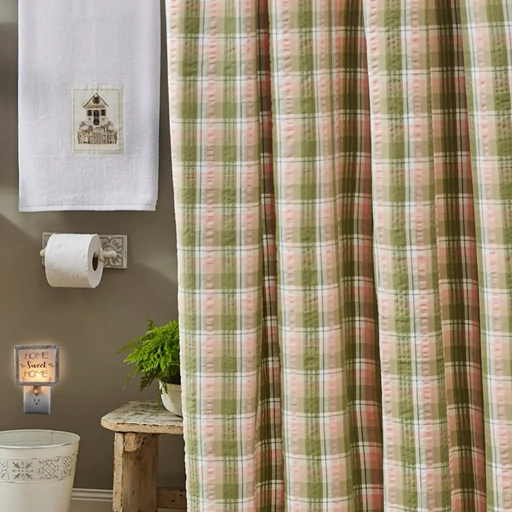 Capture the essence of relaxed, cozy cottage charm in your washroom with our Annie Portabella Buffalo Check Ruffled Shower Curtain 72x72. Classic buffalo check in portabella brown and soft white grace this decorative curtain finished with a delicate ruffle at the top and bottom for a touch of elegance. Easily hang this bath curtain with shower hooks of your choosing (not included) using the button holes attached. A 3" rod pocket is also available as an alternative hanging method.TIMELESS DESIGN & CONSTRUCTION: Expertly made with soft cotton fabric, this classic farmhouse shower curtain is artfully crafted to enjoy for years to come. Featuring a relaxing color palette of portabella brown and soft white that offers a peaceful atmosphere in your bath area. This bath accessory is lined in white cotton for extra durability and lasting charm.COORDINATING STYLE: If you love our Annie Portabella Buffalo Check Shower Curtain and you want to fill your home with coordinating vintage charm, check out our entire Annie Portabella collection for matching bedding, curtains, and farmhouse throw pillows.STANDARD SIZING: This 72x72 shower curtain fits nicely in any washroom with a standard shower or tub offering full coverage to prevent water from coming through and damaging your flooring. The use of a liner is recommended to keep mildew away.SIMPLE HANGING: Our generous-sized, quality-made buttonholes make installing this shower curtain a breeze! The shower curtain rod and shower hooks are not included. This also includes a 3" rod pocket for optional hanging.EASY CARE: Hassle-free cleaning is a must for any bathroom accessory. Simply place this shower curtain in the wash on a delicate cycle and promptly put it in the dryer on a low tumble dry setting. If you want to capture the essence of true farmhouse living, hang this bath curtain on a line to dry and safely iron if needed.