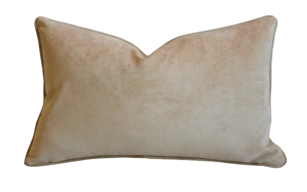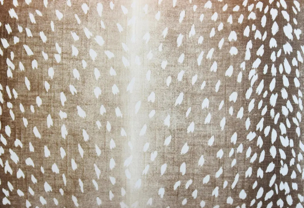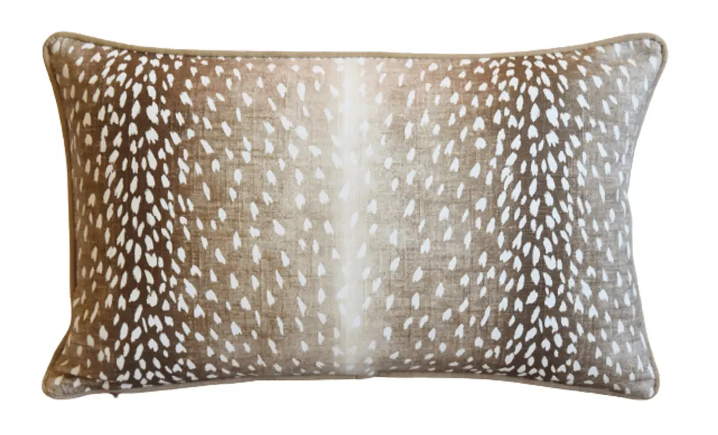 Custom-tailored pillow in a printed linen fabric depicting an antelope, deer/fawn animal spot design. Complementary cream-colored cotton velvet fabric back. Custom cord trim. Zipper closure. Generous plump goose feather-and-down insert.
