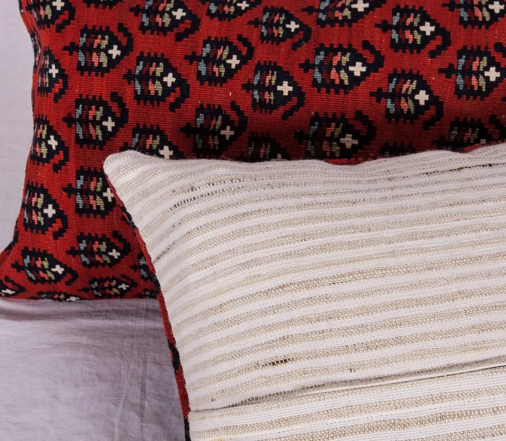 These pillow cases made from an early 20th C. armenian Karabagh kilim, have been backed with vintage jand loomed wool and cotton textile.Dry clean or spot cleaning only. Insert for the pillow cases are not provided but they come with a cotton bag made to the size to accomodate insert material.The item mentioned above is an antique so it is not in brand new condition.