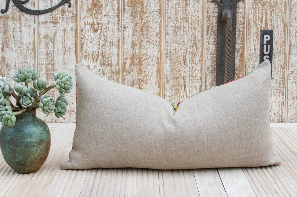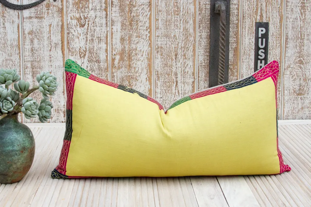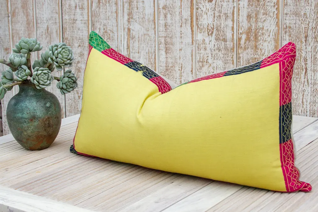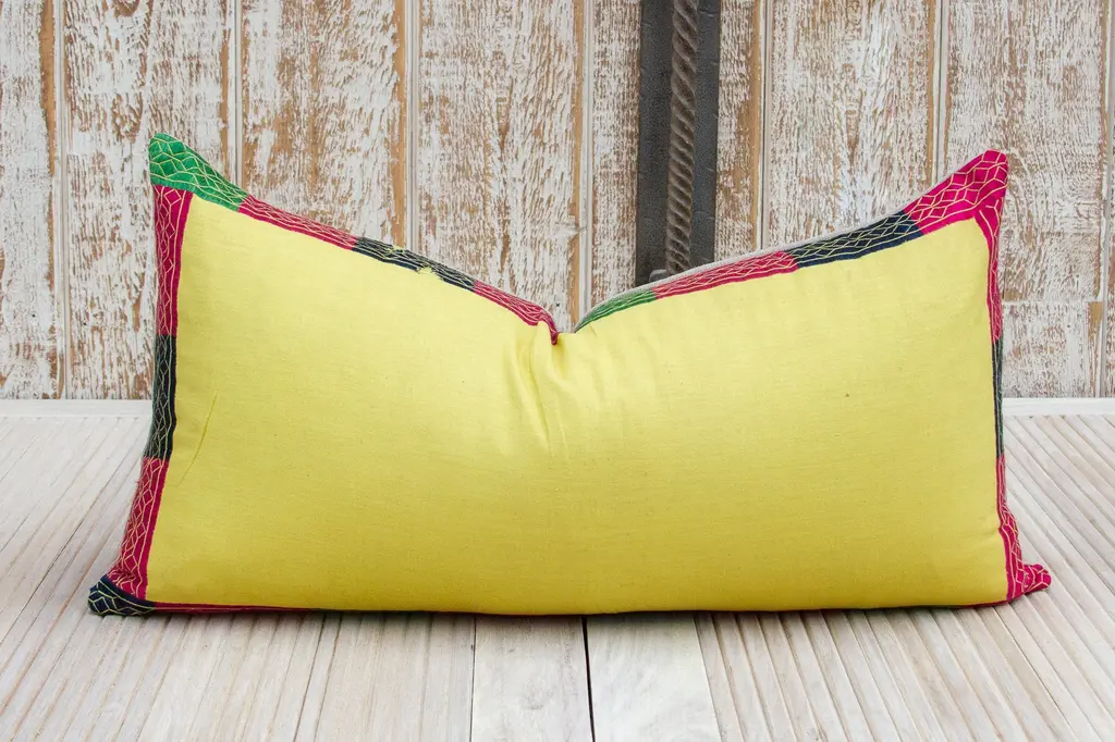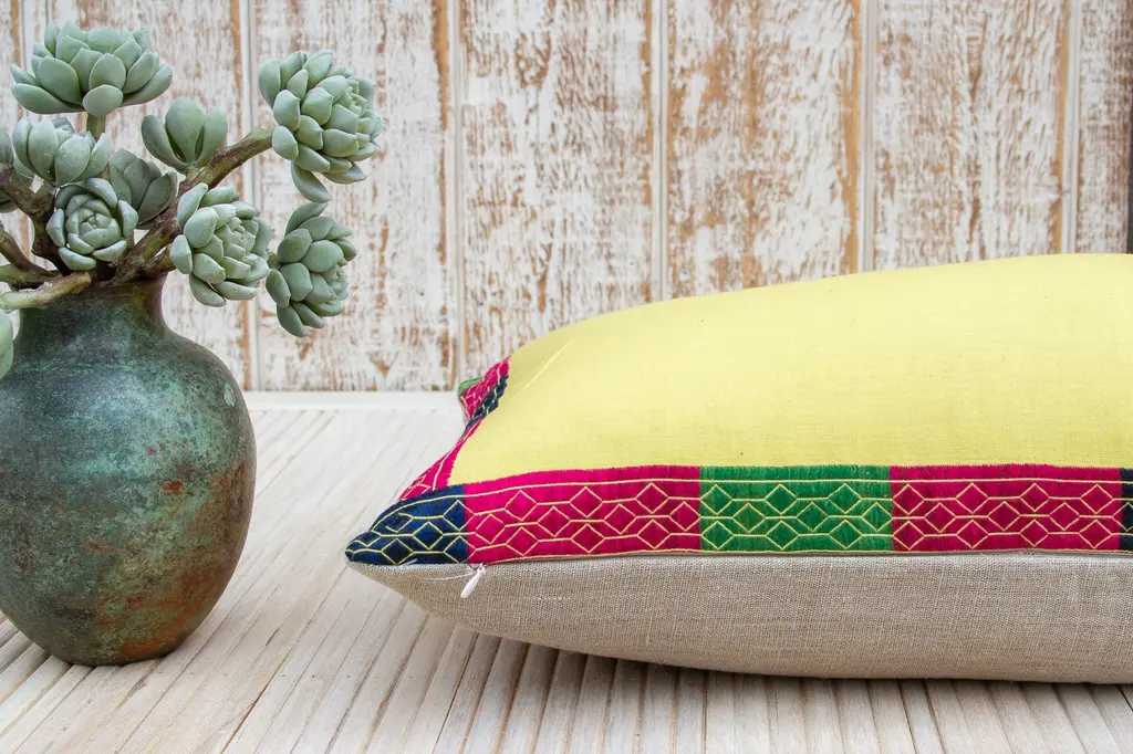 Beautiful hand-embroidered Indian throw pillow from the rich agricultural states of Punjab where artisans are famous for their "Phulkari" or floral embroidery work. Originally once used as shawls these antique textiles feature silk floss embroidery on handwoven cotton panels. The border of the shawl is adorned with embroidery work that features bold hues and elaborately scrolled motifs while the base cloth is exposed in a beautiful bright yellow color.