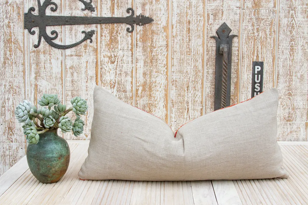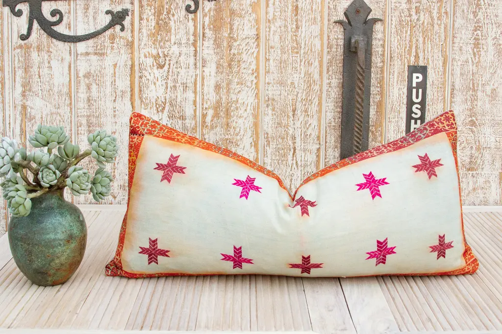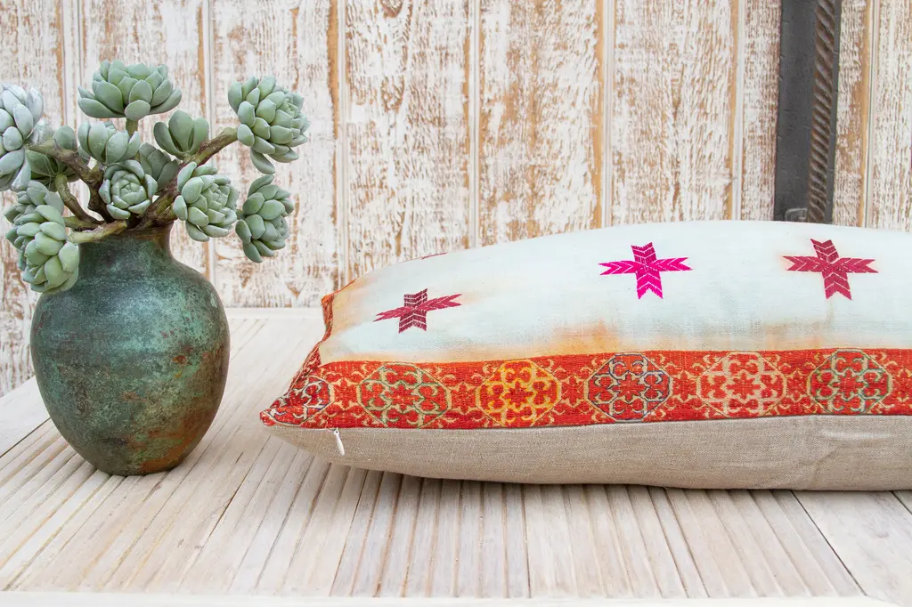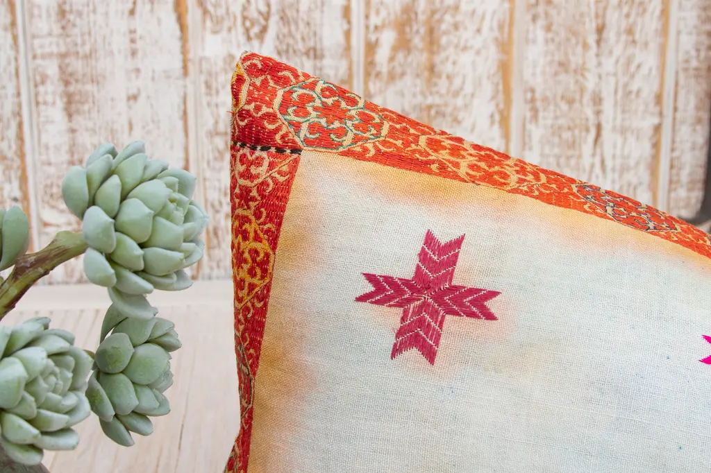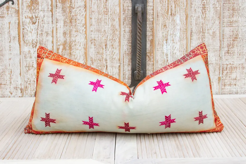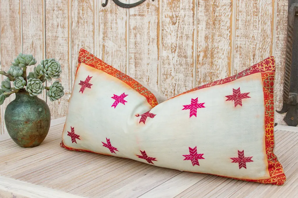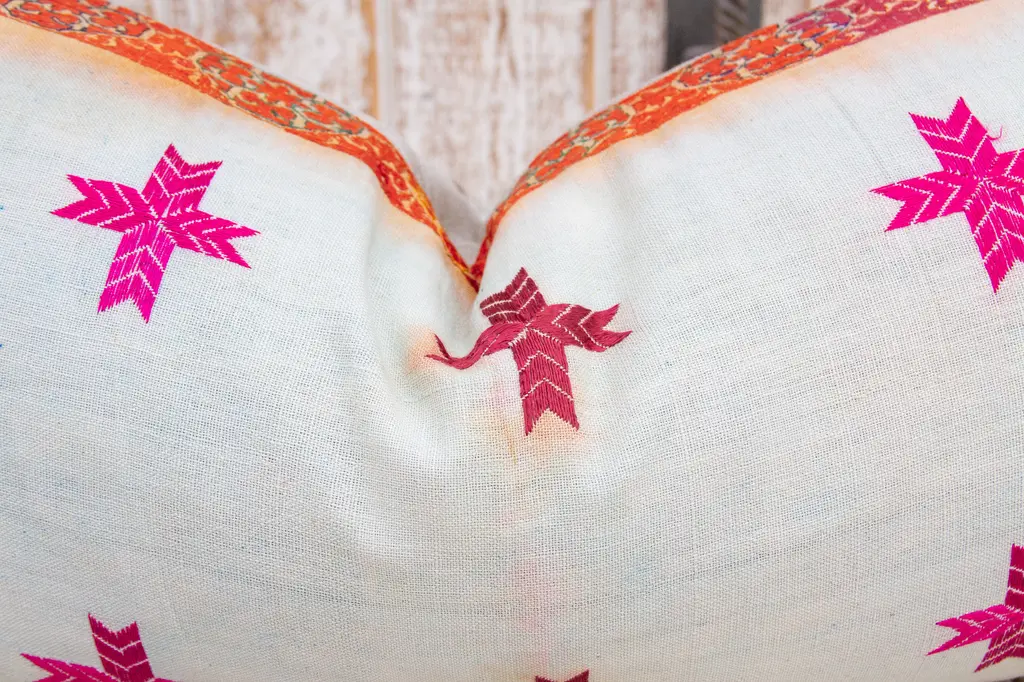 Beautiful hand-embroidered decorative throw pillow from the rich agricultural states of Punjab where artisans are famous for their "Phulkari" or floral embroidery work. Originally once used as shawls these antique textiles feature silk floss embroidery on handwoven cotton panels. The border of the shawl is adorned with embroidery work that features bold hues and elaborately scrolled geometric motifs while the base cloth is exposed in its natural linen color.