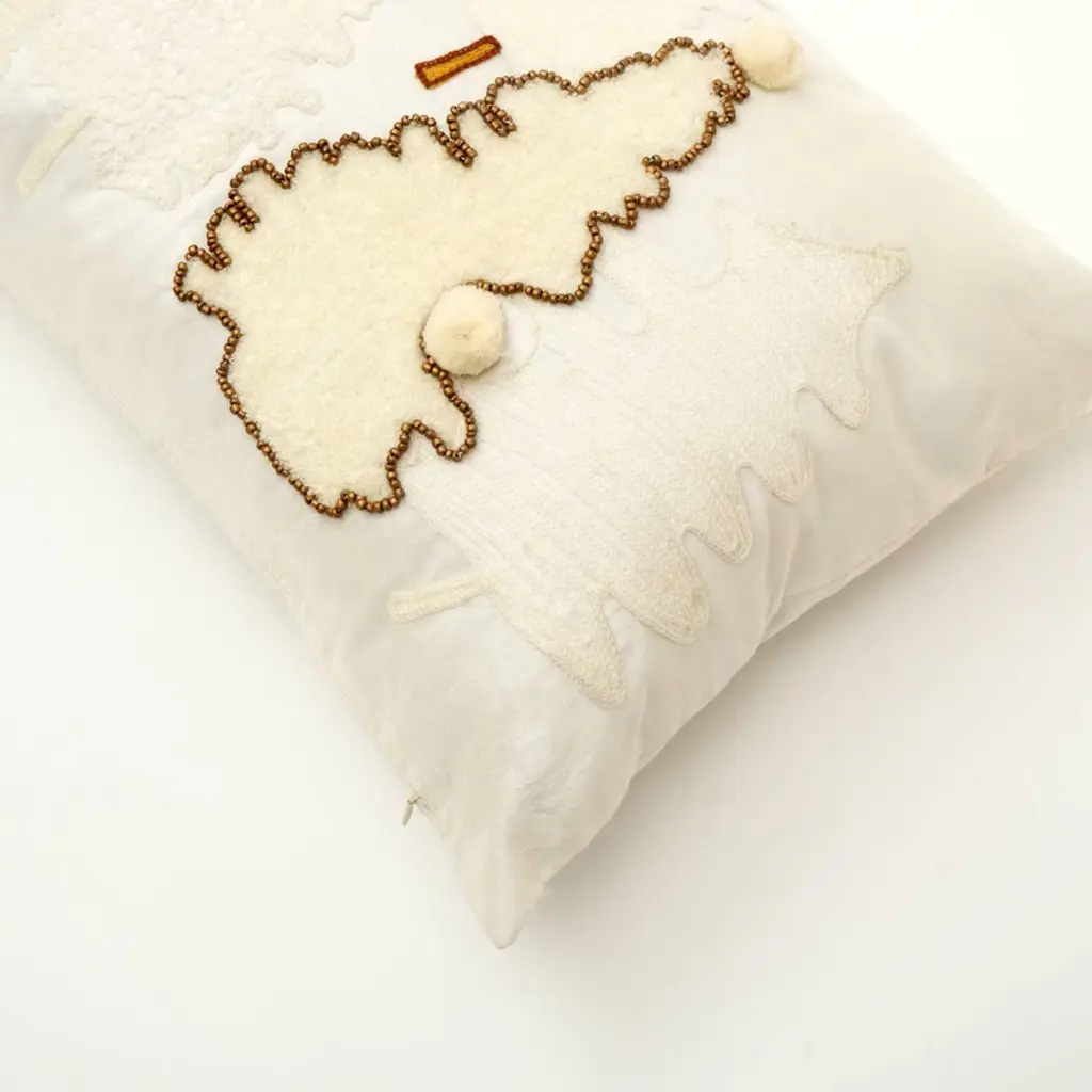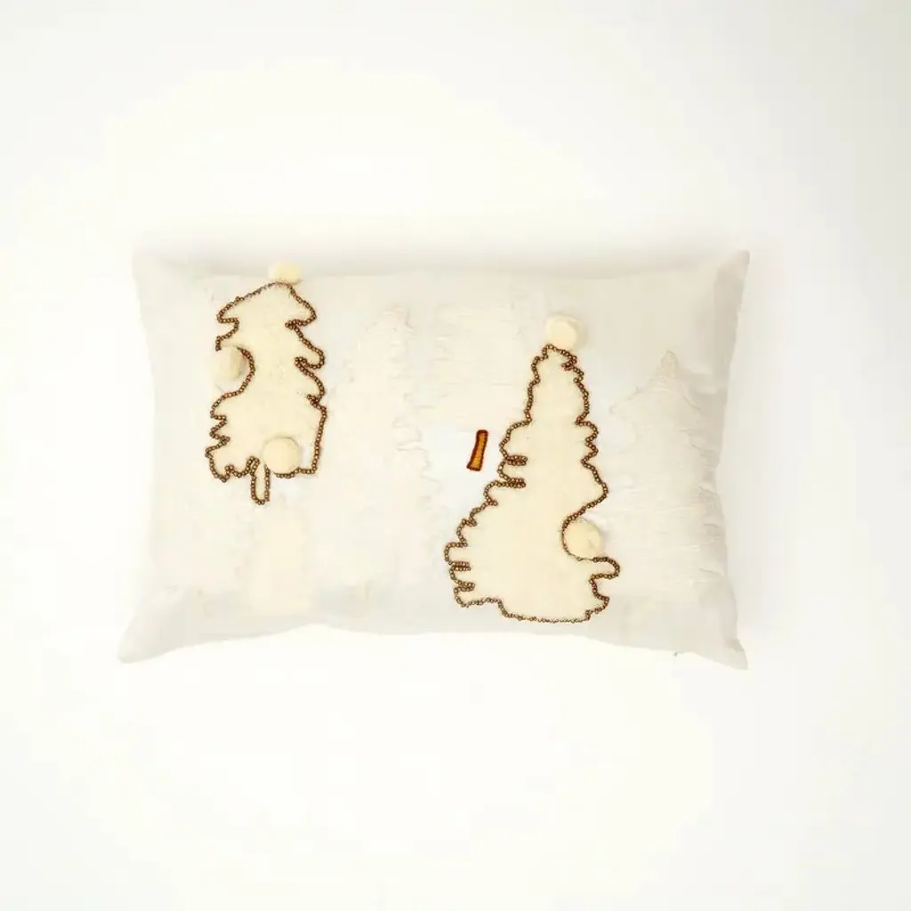 Celebrate the season outdoors with this 24x16" Christmas throw pillow, featuring embroidered holiday trees and playful pom-pom accents.