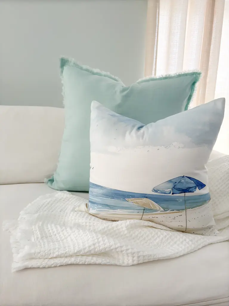 The Fringe Soft Linen Pillow is Soo soft- you won’t believe it's linen! This yarn has a slight nub which gives it a beautiful natural texture. Edges have a self-fringe on all sides. Sizes: 14"x20", 20"x20", 26"x26". Details Front & Back Color: Aqua Blue Front & Back side: 100% Linen (Pre-washed) Concealed zipper closure on back side. Spot Clean. Hang to Dry. Imported. Pillows are available in 3 options:Pillow Cover Only, with a Down Alternative insert, or with a Down InsertDown Alternative InsertBenefits: Allergen free, Better back support, Retain their shapeInside Fill: 1.2 denier x1.25" polyester gelOuter Shell: 65% polyester/ 35% white cotton blendMade in the USA Down InsertBenefits: Durable, Easy to fluff and re-style, Retains heatInside Fill: 95% gray duck feathers and 5% goose downOuter Shell: 233-thread count 100% cotton fabric Made in the USA