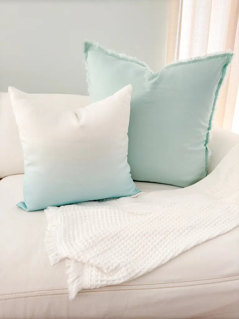 The Fringe Soft Linen Pillow is Soo soft- you won’t believe it's linen! This yarn has a slight nub which gives it a beautiful natural texture. Edges have a self-fringe on all sides. Sizes: 14"x20", 20"x20", 26"x26". Details Front & Back Color: Aqua Blue Front & Back side: 100% Linen (Pre-washed) Concealed zipper closure on back side. Spot Clean. Hang to Dry. Imported. Pillows are available in 3 options:Pillow Cover Only, with a Down Alternative insert, or with a Down InsertDown Alternative InsertBenefits: Allergen free, Better back support, Retain their shapeInside Fill: 1.2 denier x1.25" polyester gelOuter Shell: 65% polyester/ 35% white cotton blendMade in the USA Down InsertBenefits: Durable, Easy to fluff and re-style, Retains heatInside Fill: 95% gray duck feathers and 5% goose downOuter Shell: 233-thread count 100% cotton fabric Made in the USA
