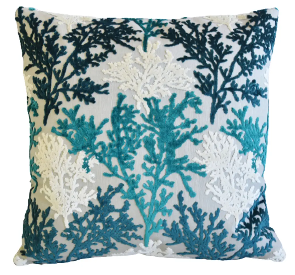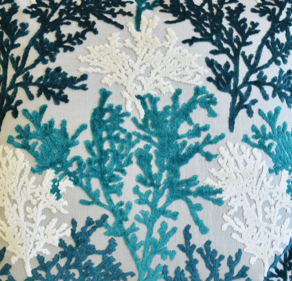 Custom-tailored pillow in cut-velvet fabric with a nautical coastal coral reef design. Same fabric on reverse. Zipper closure. Plump goose down-and-feather insert. Please note: The placement of the design may vary according to the fabric cut. Excellent new unused condition.