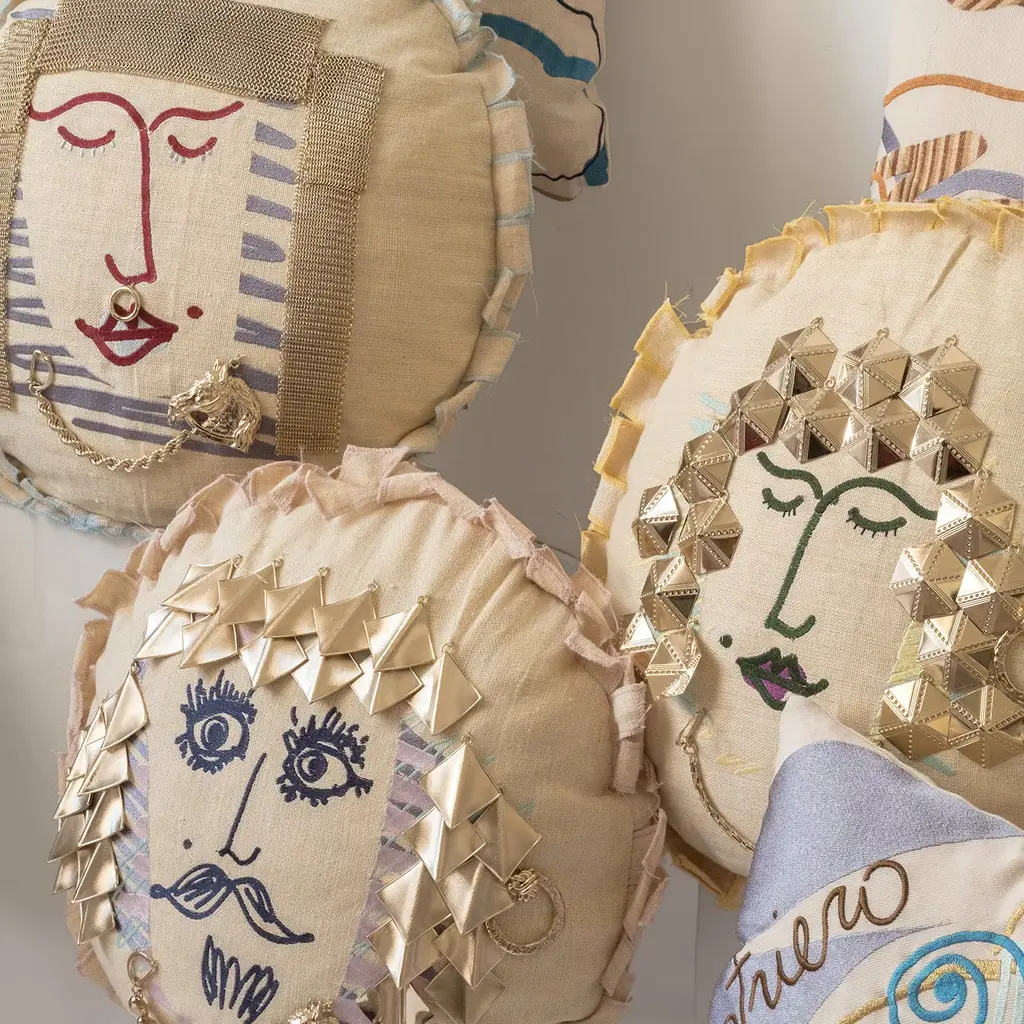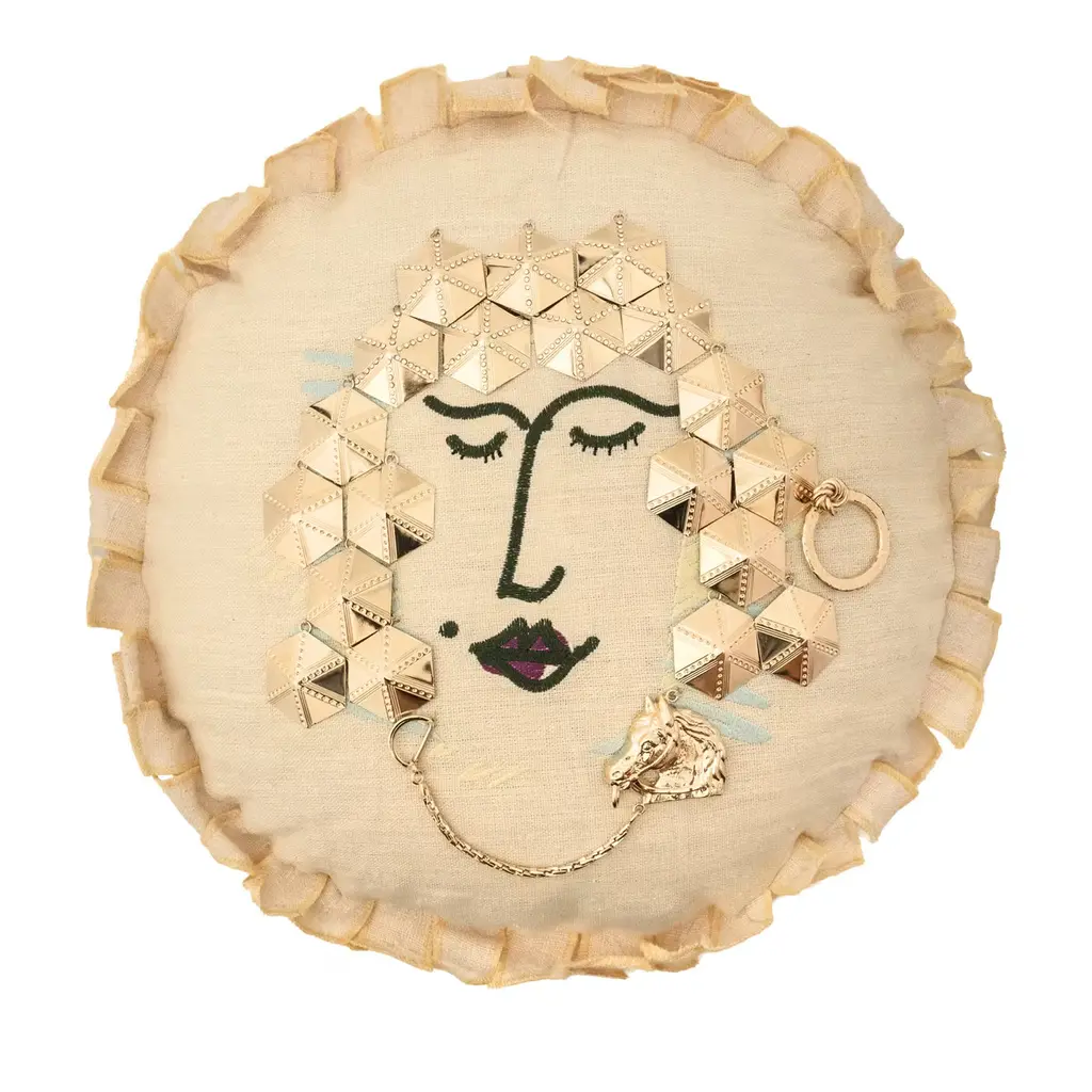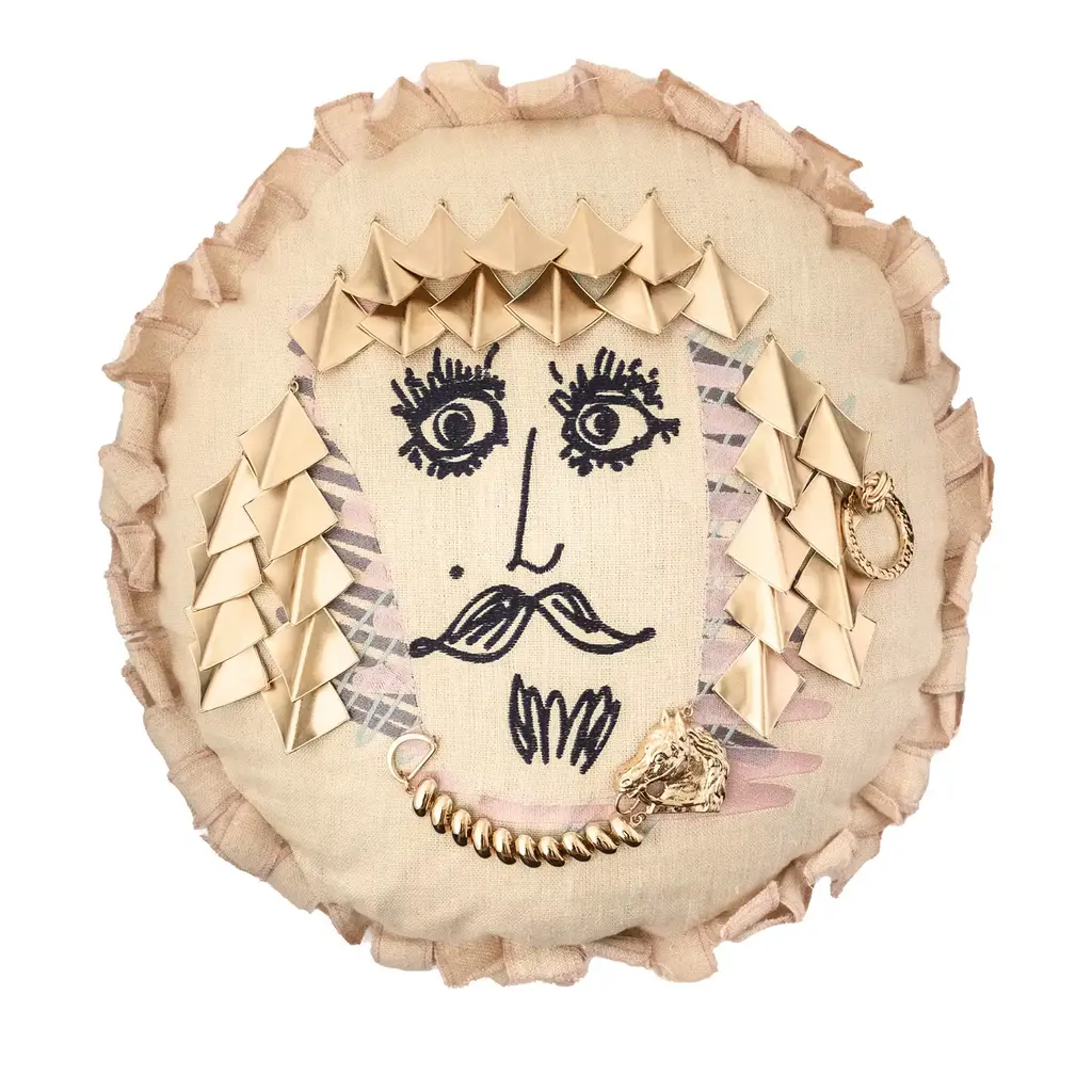 A one-of-a-kind collector's piece of refined sophistication, this objet d'art is a handcrafted cushion that depicts a knight of the Kingdom of the Two Sicilies during Spanish rule. Fashioned of linen, rattan, and natural kapok, this round cushion is embellished with brass details evoking the metal armor of the knight.