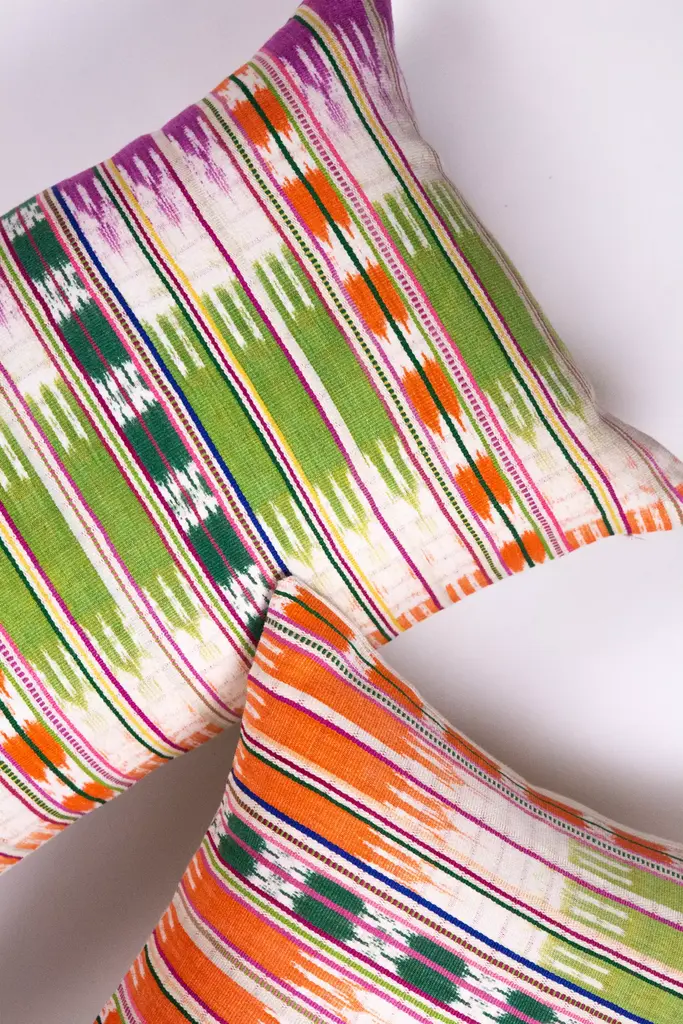 The perfect pattern pop youve been looking for. This pillow was made from a vintage Guatemalan corte (skirt), fabric. It is hand dyed using a resist ikat dying technique, with multi-colored stripes, then handwoven on a footloom. Please note, this item is made with vintage fabric, and will have imperfections that make it all the more unique and beautiful. Archive New York is a line of handwoven, artisan made home decor products, founded in 2014 in Brooklyn, NY. The founder, Amira Marion, grew up in a home filled with Guatemalan textiles gathered by her parents in the 1970s. Her own designs emphasize a deep connection with Central American artisans, a commitment to Fair Trade practices, and the honoring of Maya culture, heritage and technique. * 90% handwoven cotton /10% rayon * Dry clean only * Imported * Bottom zip * Feather/down insert included #### *Dimensions* * 12 x 20