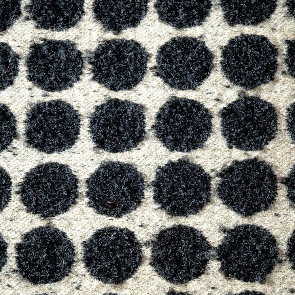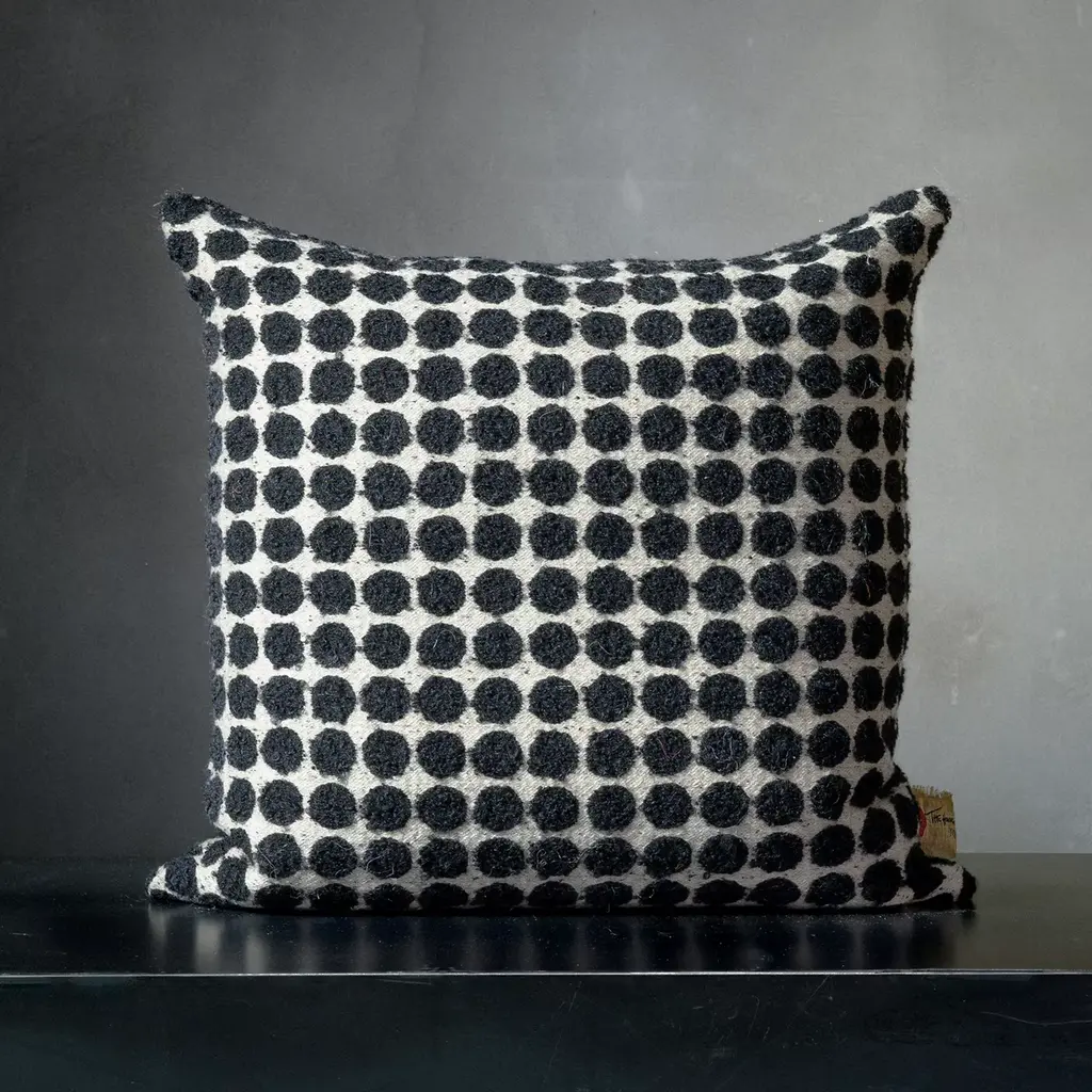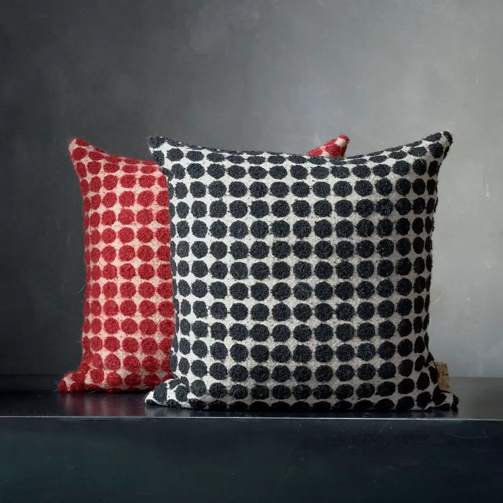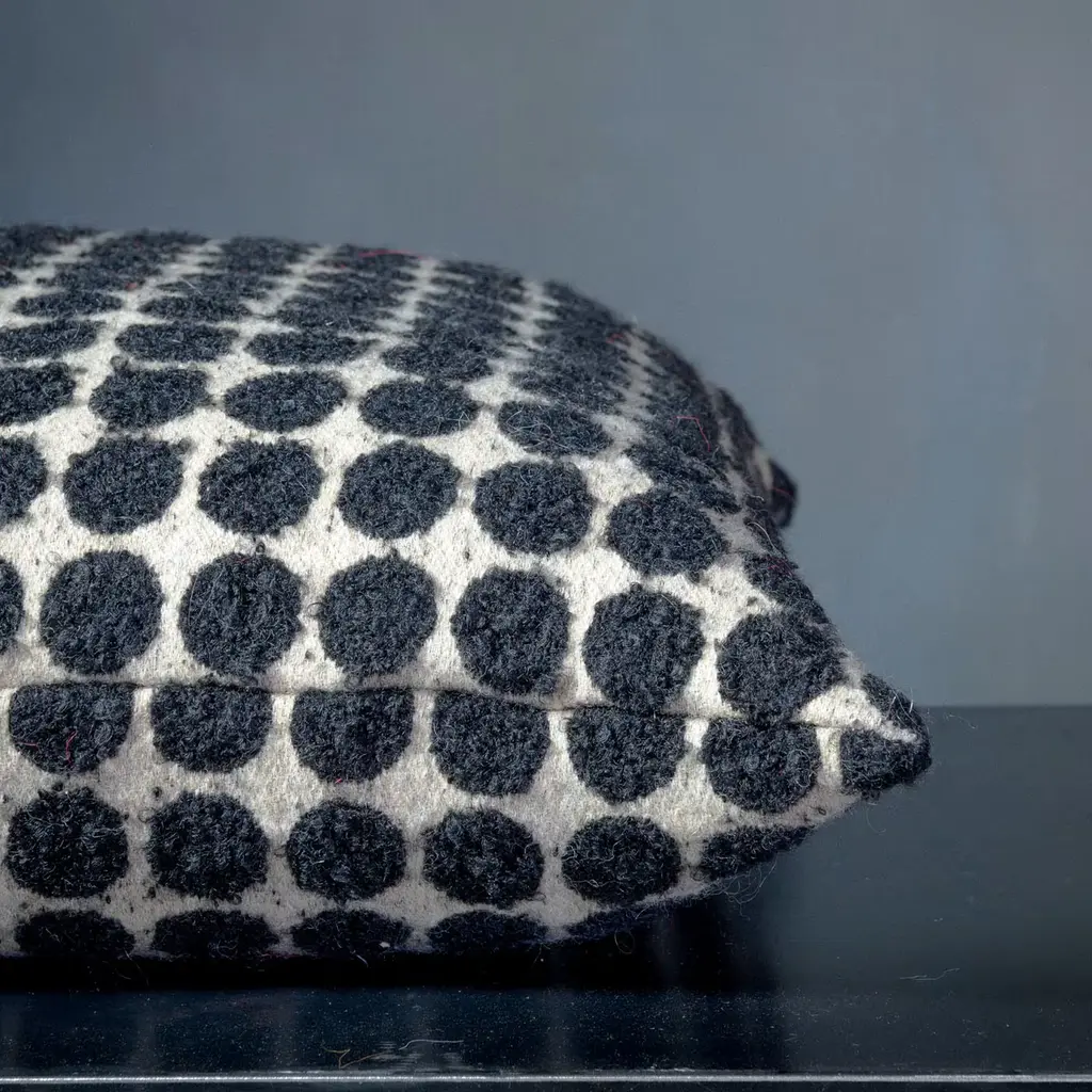 Vintage and timeless references characterize the hypnotizing yet refined design of this square cushion. Obtained from a blend of wool and Mohair yarns, it flaunts an intriguing 3-D quality owed to the black boucle pattern that immediately captures the eye against the white backdrop. A red and white variant is available in the Artemest catalog.