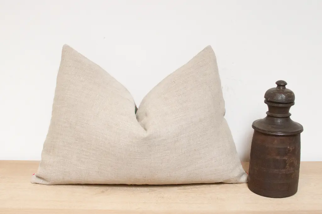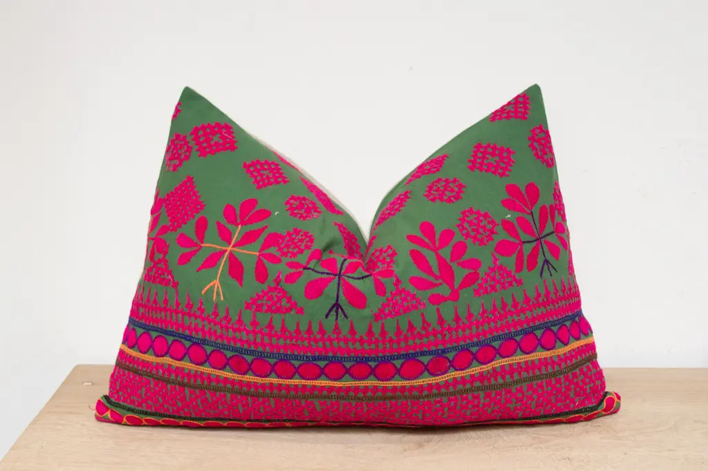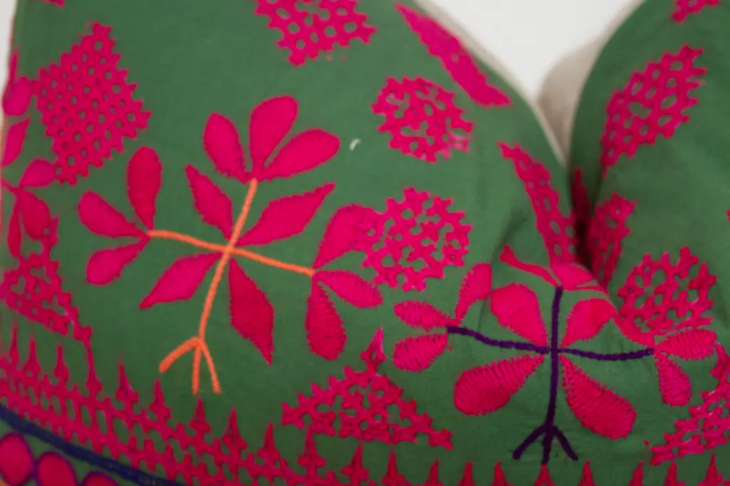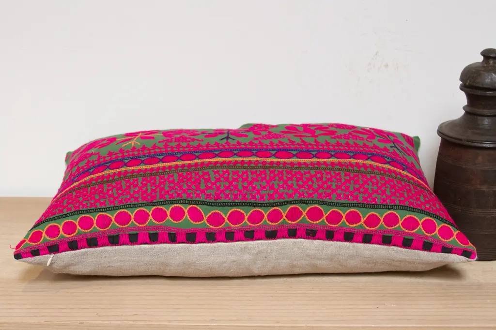 A lovely hand-embroidered pillow made from vibrant vintage tribal skirts coupled with a new linen back. This intricate lace-like and floral embroidered cotton pillow is the perfect splash of color to add to any space. This throw pillow has a hidden zipper and comes filled with a down-blend insert. For care and maintenance, remove the insert and dry clean only.