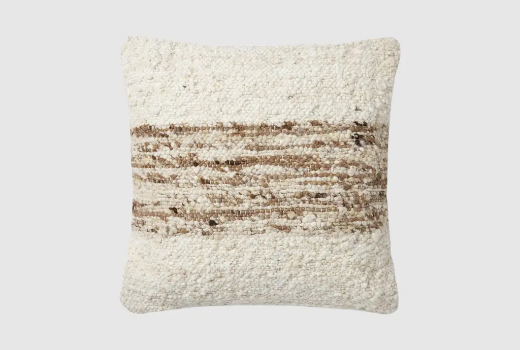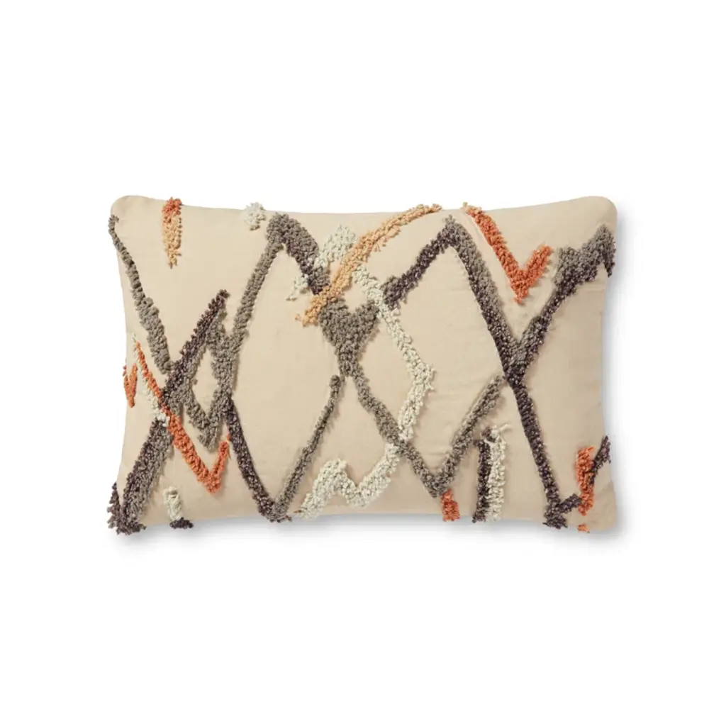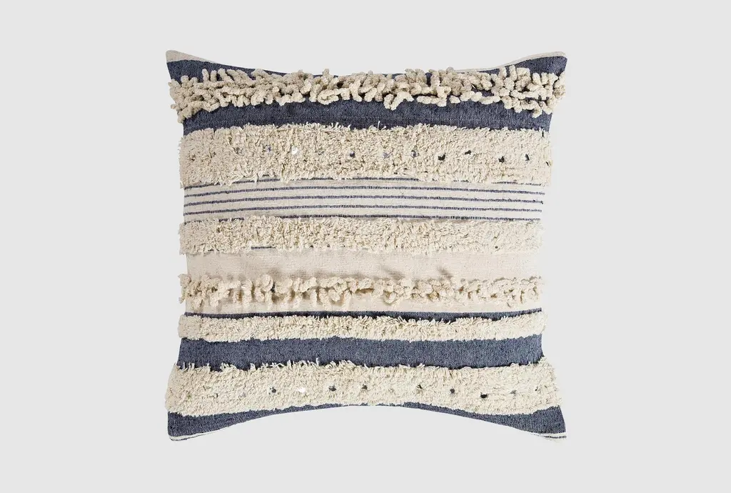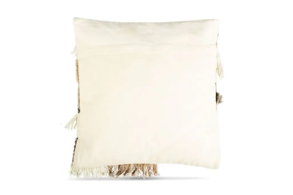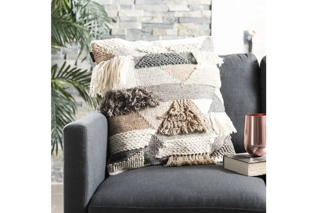 Geometric stitching, loopy yarns, and shaggy fringe create a dramatic combination on the Arwen Toss Pillow, sure to add dimensional detail to any indoor space.