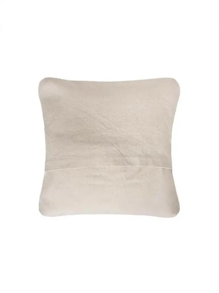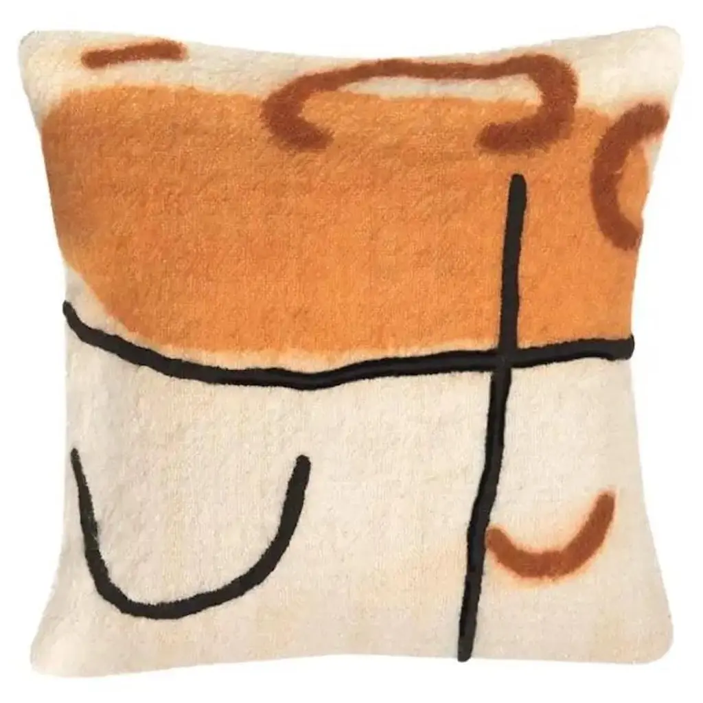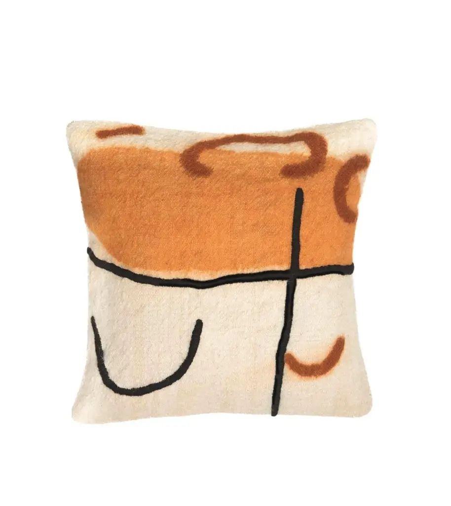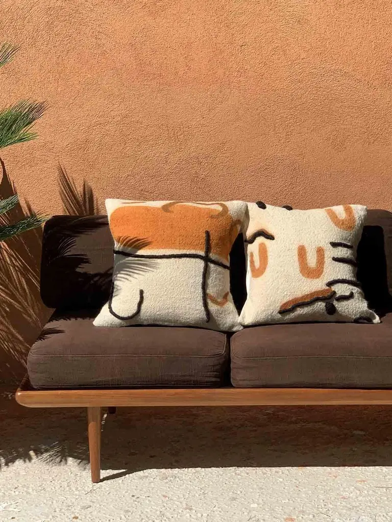 Handspun and handwoven white, orange and brown pillow - Front: 100% Siroua wool, an endangered sheep living in a volcanic massif with very long wool fibers, located less than 100 km from the weavers' village- Back: 100% cotton woven in Morocco- Decorative motifs painted by hand with henna paste and several tinctorial plants by women dyers masters- Decorative motifs embroidered by hand - Made in the Anti-Atlas region by the weavers from the Feija tribe- Co-created by the weavers x memòri teamApproximate measurements: 19.7 x 19.7 in // 50 x 50 cm weight : 0.5 kg // 1.1 lbThe Anti-Atlas region of Morocco seems to be the only region in the world where henna is not only used to adorn the skin or to dye hair but also to decorate woollen textiles. Women weavers go on keeping this ancestral savoir-faire alive from generations to generations.Handmade: Variation is to be expected, each piece differs in color, size, shape and decorations due to its handmade nature and natural dyes. memòri is about simplicity, imperfections, and embracing the "flaws".Care instructions: Hand wash cold with wool detergent only when really necessary.About the savoir-faire, the art of weaving and natural dyeing in the Moroccan Anti-AtlasIn the Moroccan Anti-Atlas region, henna is considered a sacred plant. It acts as a protective talisman during wedding ceremonies and true “rites of passage”. In these territories, one of the oldest Berber tribes is the Feija tribe. During wedding ceremonies, and in particular during the wedding night, the bride wears a wool veil, painted with henna. In a landlocked village in this territory, women weavers carry on this hitherto unknown ancestral tradition of giving life to textiles. The veils, and the unique method of their creation are passed down from generation to generation from mother to daughter. These women are the guardians of this tradition.About the artisanThis village is landlocked in the mountains of the Moroccan Anti-Atlas, until the early 2000s, it was accessible only on foot or accompanied by mules. The architecture of their typical houses is entirely made of local stones. Two cooperatives and more than 45 Berber women work in this tribal territory. Women weavers and dyers go on keeping this ancestral savoir-faire alive as the veil is still used for wedding ceremonies.