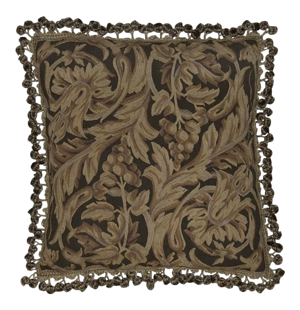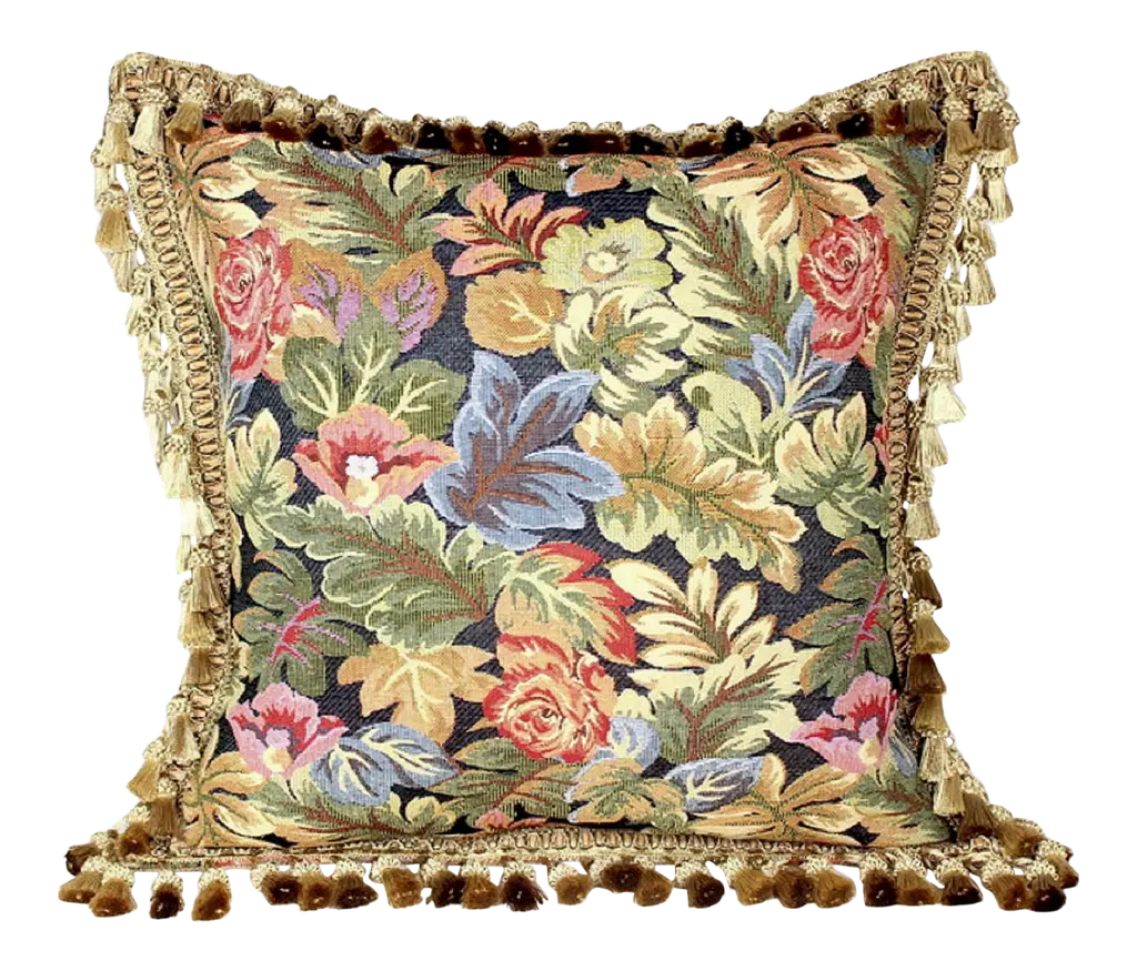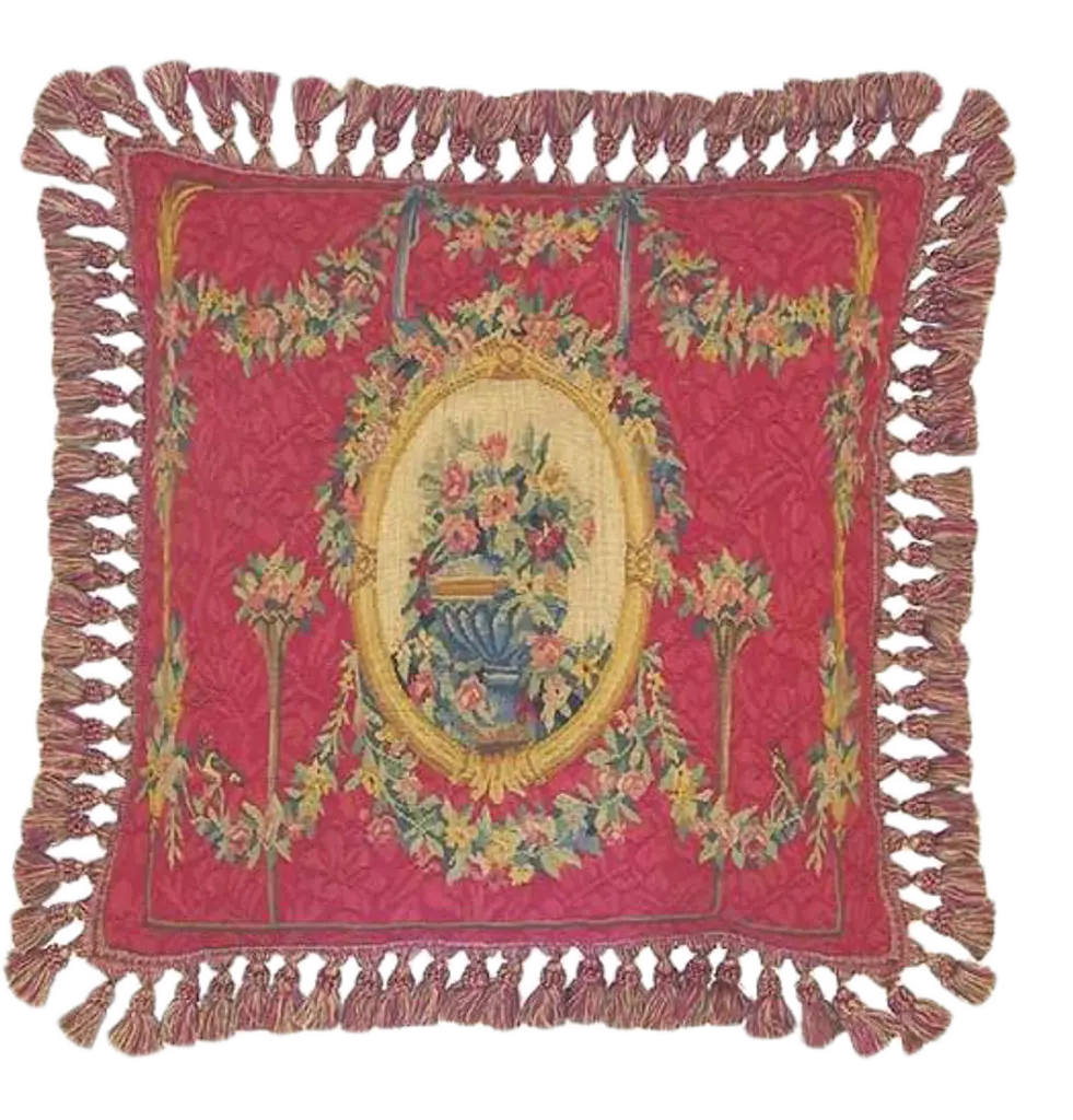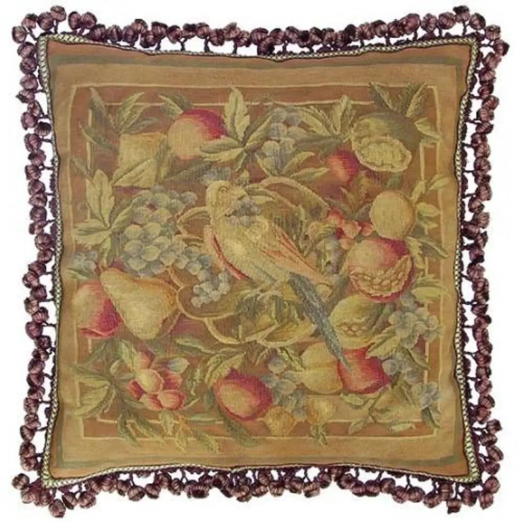 Overall measurements (inches) 22H x 22W x 4D. This parrot is a chirpy chappy, taking his pick of fruit on the lovely new Aubusson throw pillow. Handwoven in wool, the 22" square throw pillow features blue and red accents and it is trimmed with onion tassels. Backed with zippered beige velvet, the Aubusson parrot and fruit throw pillow includes a removable down and feather insert. Overall Condition is New. Material(s): Wool, Velvet, Down/Feather Insert. Style: Aubusson. Dates to circa New.