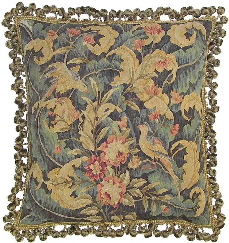 New Aubusson Throw Pillow Handwoven 22"x22" Overall measurements (inches) 22H x 22W x 4D. The inviting scene of beautiful birds depicted on this new handwoven Aubusson throw pillow will make an elegant addition to your decor. Handwoven in wool, the yellow and blue birds and foliage adorning the 22" square Aubusson throw pillow contrast prettily with pink flowers. Trimmed with tassels, the handwoven Aubusson throw pillow is backed with zippered beige velvet. Overall Condition is New. Material(s): Down/Feather Insert,Wool,Velvet. Style: Aubusson. Dates to circa New.