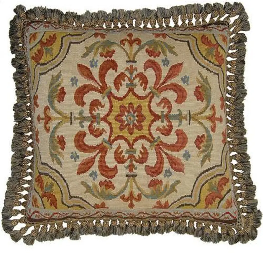 Overall measurements (inches) 22H x 22W x 4D. The bold and summery design of fleur de lis on this exceptional new handwoven Aubusson throw pillow will make a striking statement in your home. Handwoven in wool, trimmed with tassels and backed with zippered beige velvet, the Aubusson square throw pillow includes a removable down and feather insert. Overall Condition is New. Material(s): Velvet, Pure Wool, Down/Feather Insert. Style: Aubusson. Dates to circa New.