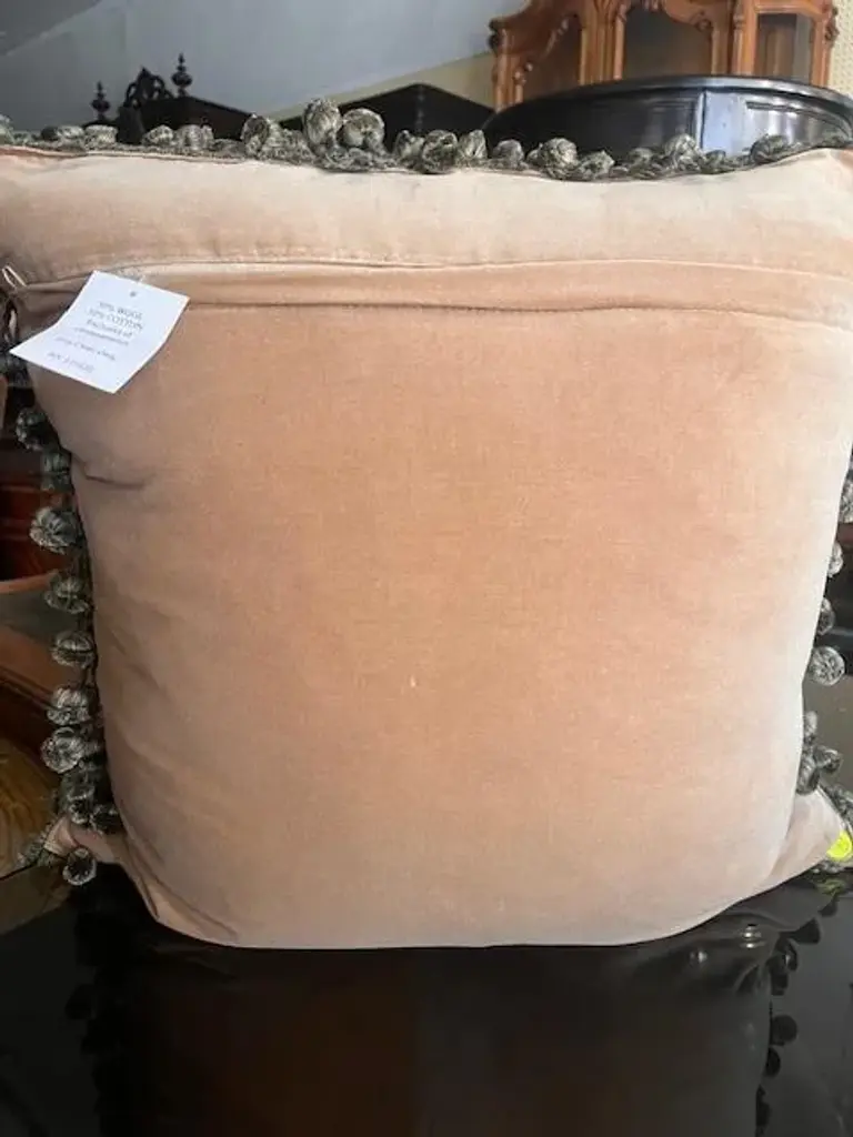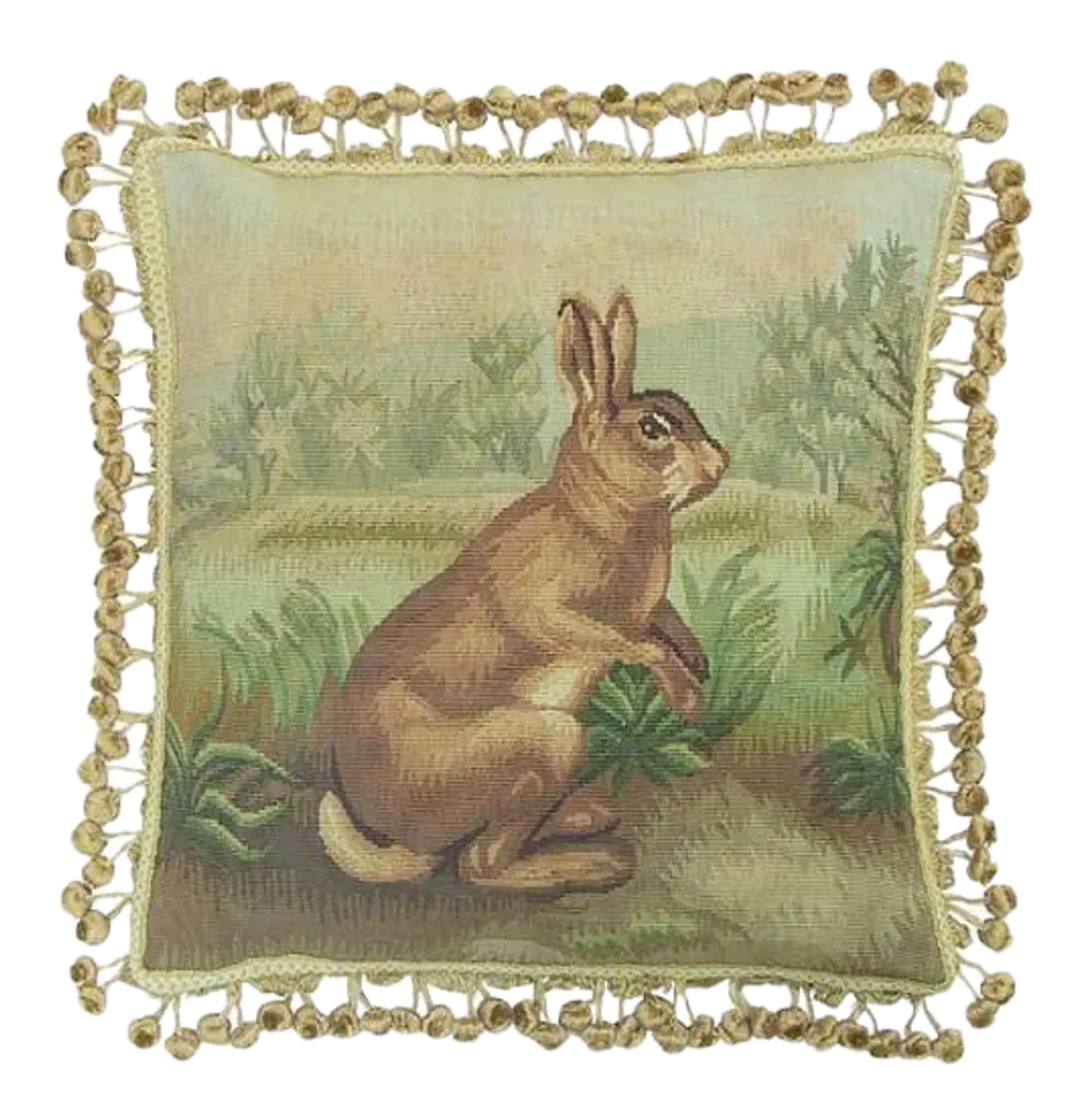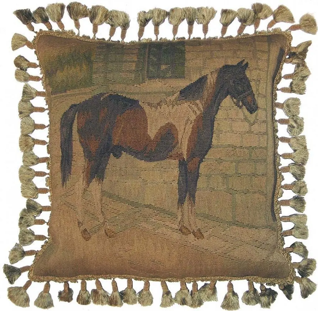 Overall measurements (inches) 20H x 20W x 4D. A noble horse stands outside his country stable on this fine new Aubusson throw pillow. Handwoven in wool, the 20" square throw pillow shows a horse facing right and it is trimmed with tassels. Backed with zippered beige velvet, the Aubusson horse throw pillow includes a removable down and feather insert. Overall Condition is New. Material(s): Down/Feather Insert, Wool, Velvet, Aubusson. Style: Country Cottage. Dates to circa New.