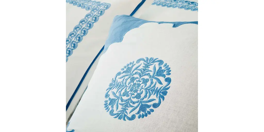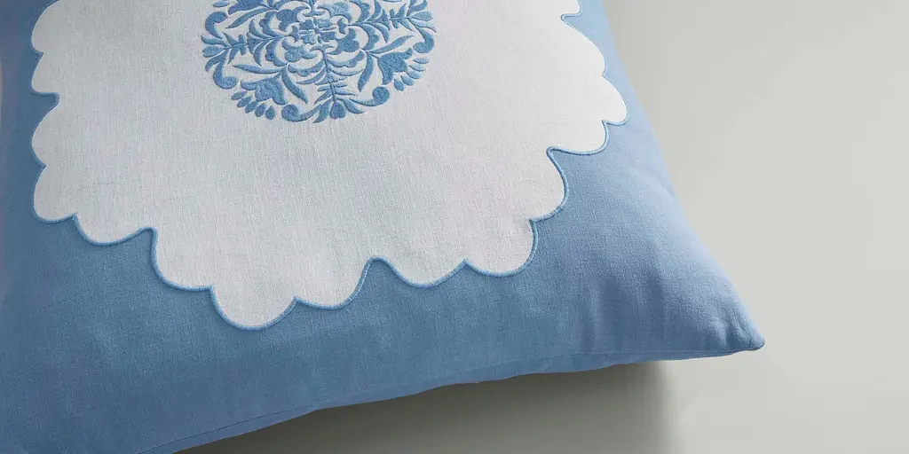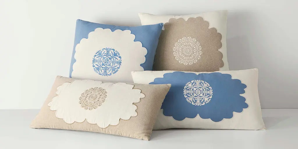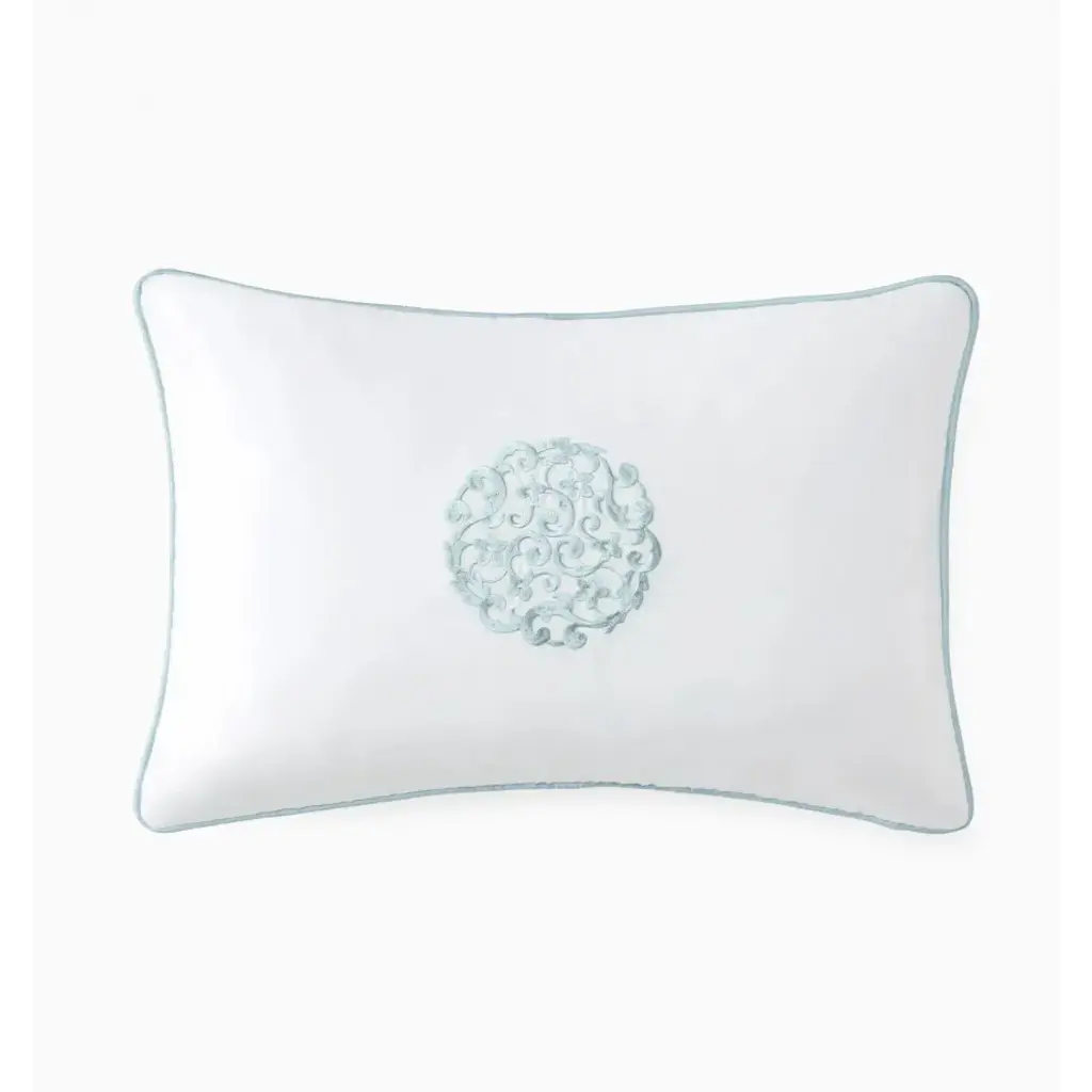 Featuring an ornate central medallion and a delicate scalloped border, the Augusta Pillow blends soft whimsy with traditional design. The embroidered applique is on a soft, 100% cotton chambray fabric, making this the perfect accent for a bed, chair, or sofa. Complete with a knife edge finish and zipper closure. Available in 2 colorways.
