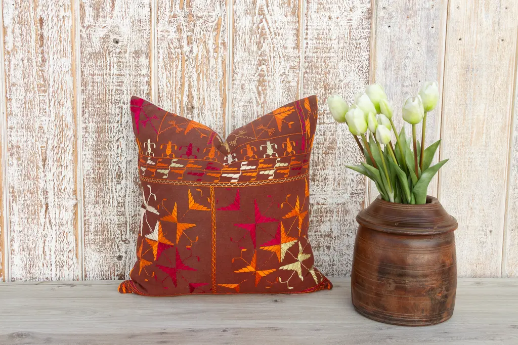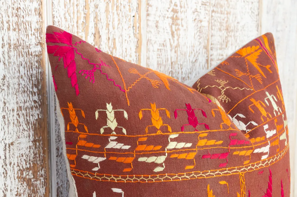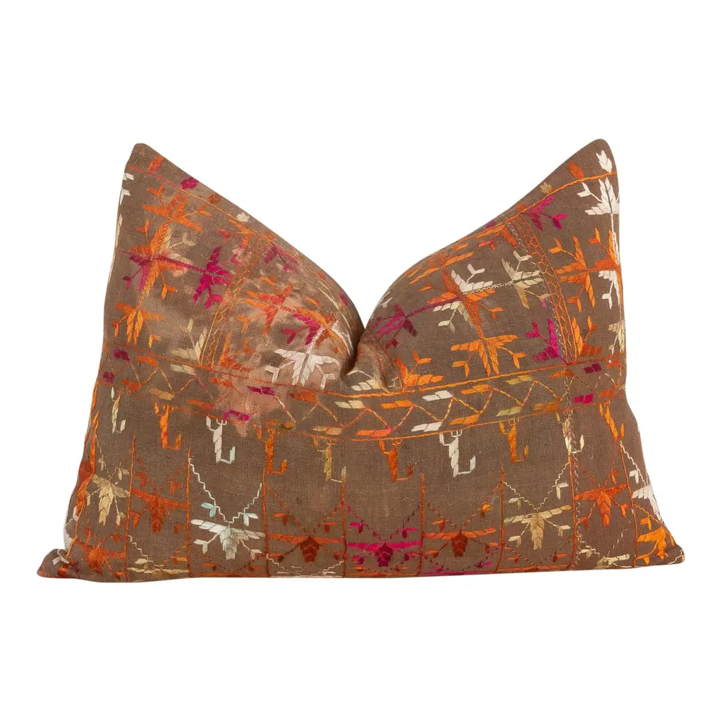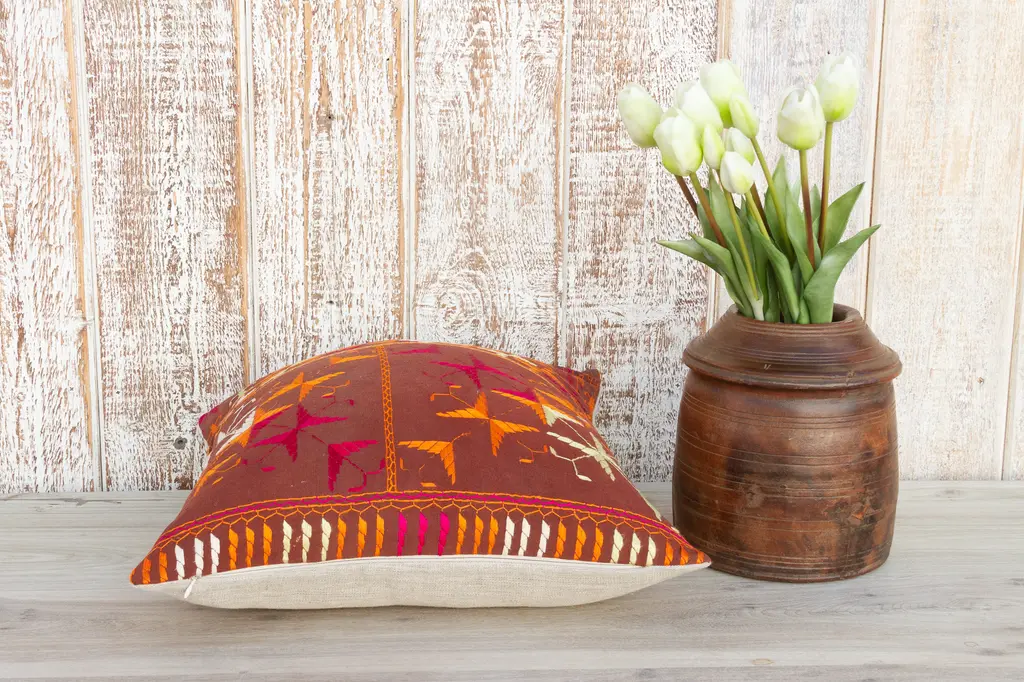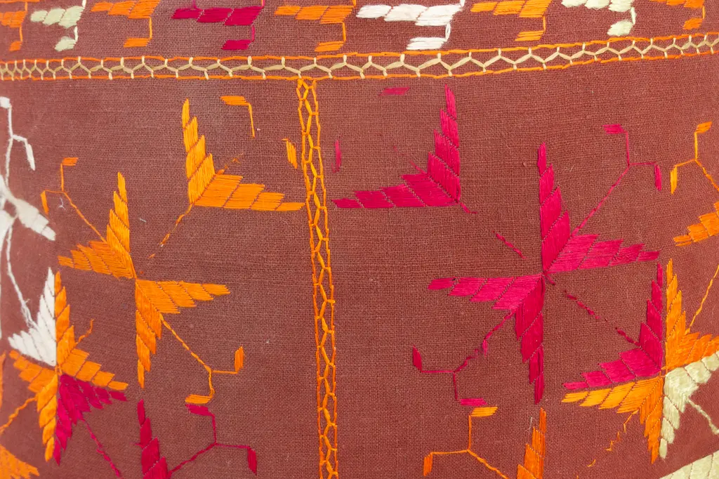 This colorful and luxurious Bagh Phulkari pillow features beautiful hand-done silk embroidery on top of a cotton fabric. Phulkari means "flower work" and is very descriptive of this vibrant, delicate pillow. Phulkari fabrics are often used in ceremonies concerning birth and marriage.