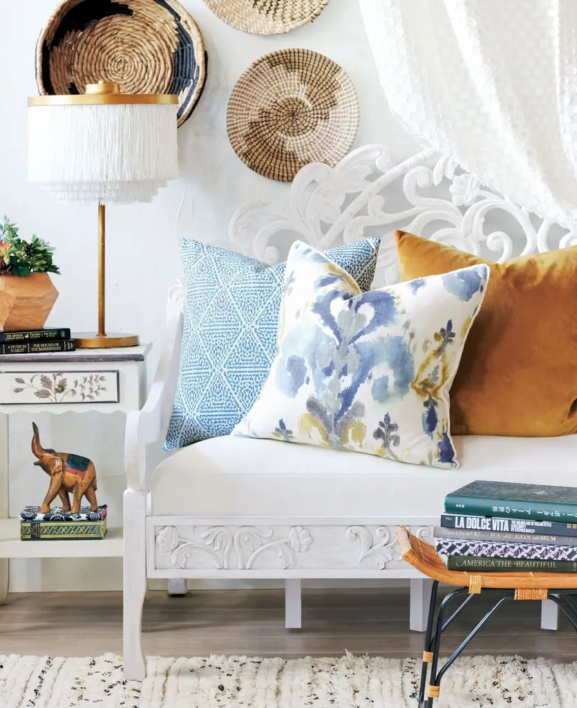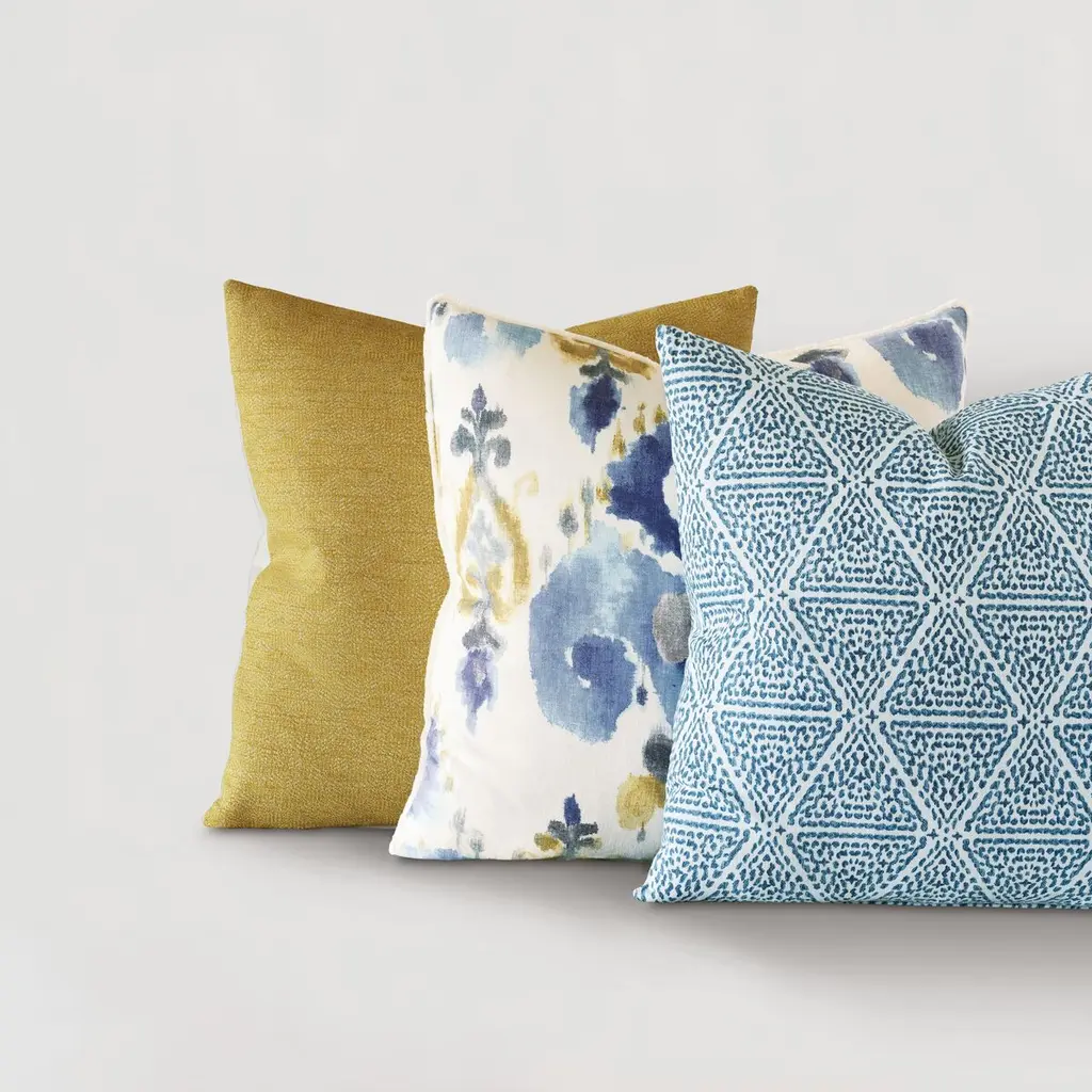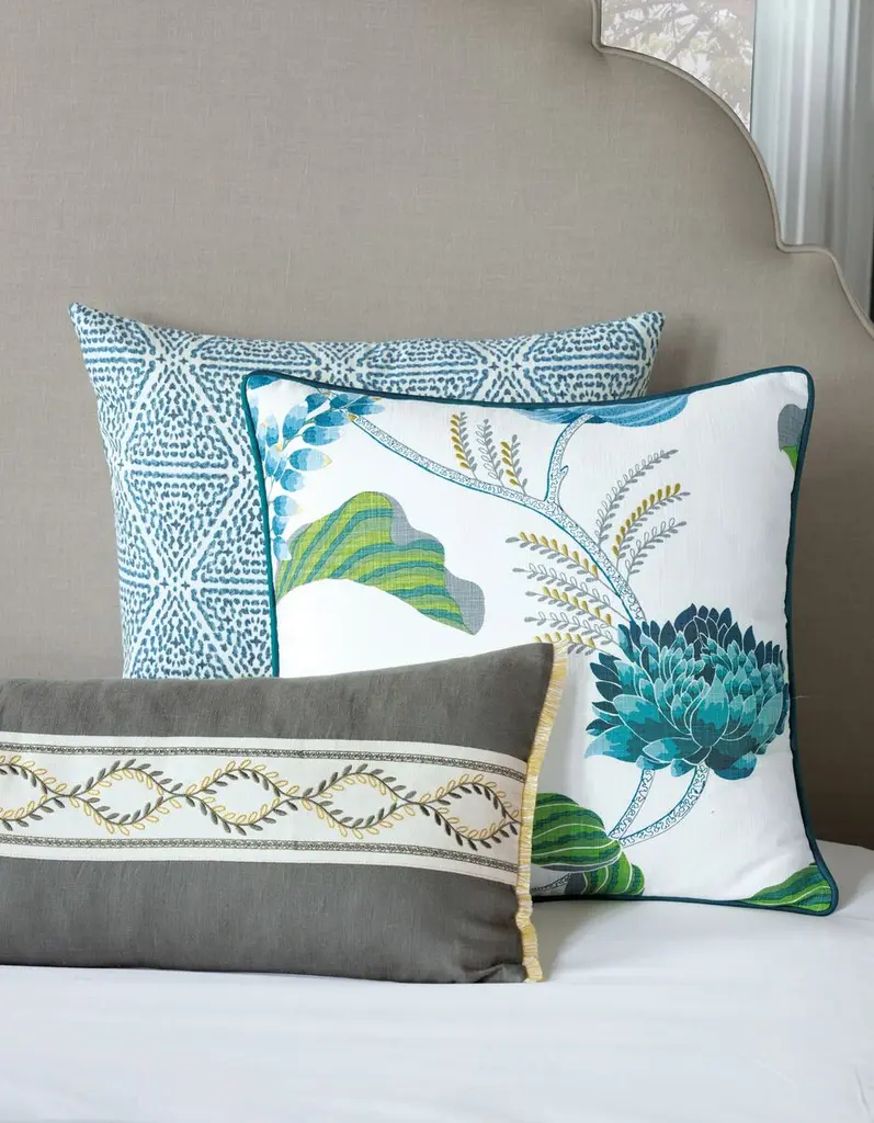A blue-on-white pointillist motif adorns both sides of this cotton-and-linen throw pillow. Made in the USA, the pillow is generously filled with plume feathers for lush comfort. Zipper closure.