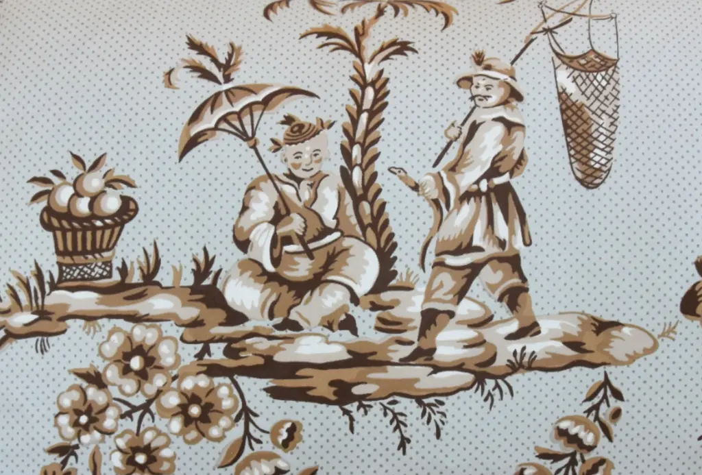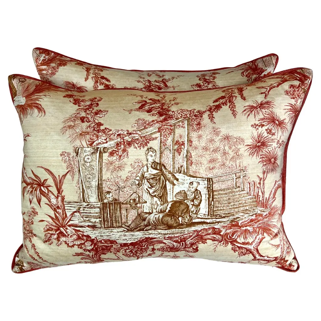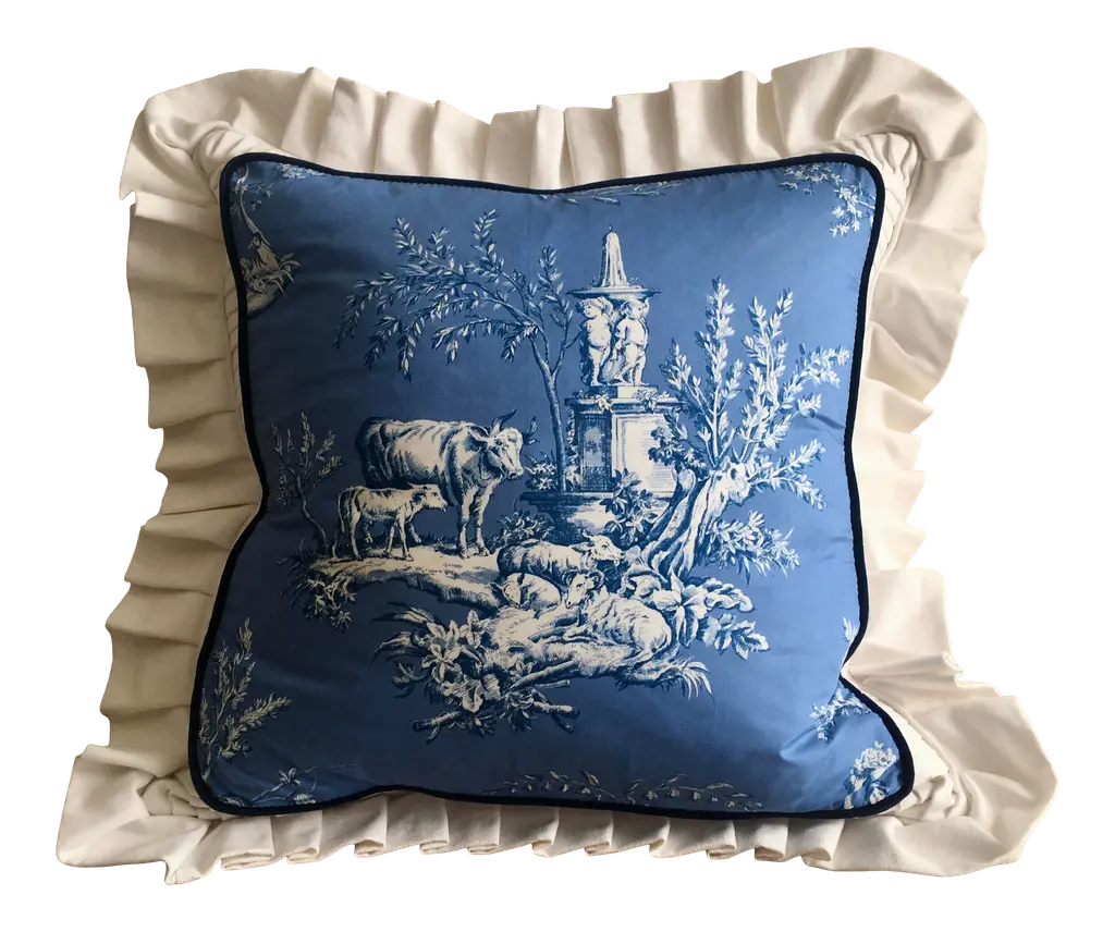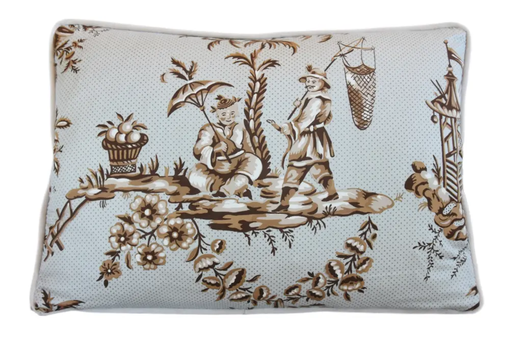 Bespoke custom-tailored pillow in designer Bailey & Griffin "Chinoise" printed cotton fabric. Cream cotton-velvet fabric back. Zipper closure. New generous goose down-and-feather insert. Excellent new unused perfect condition.