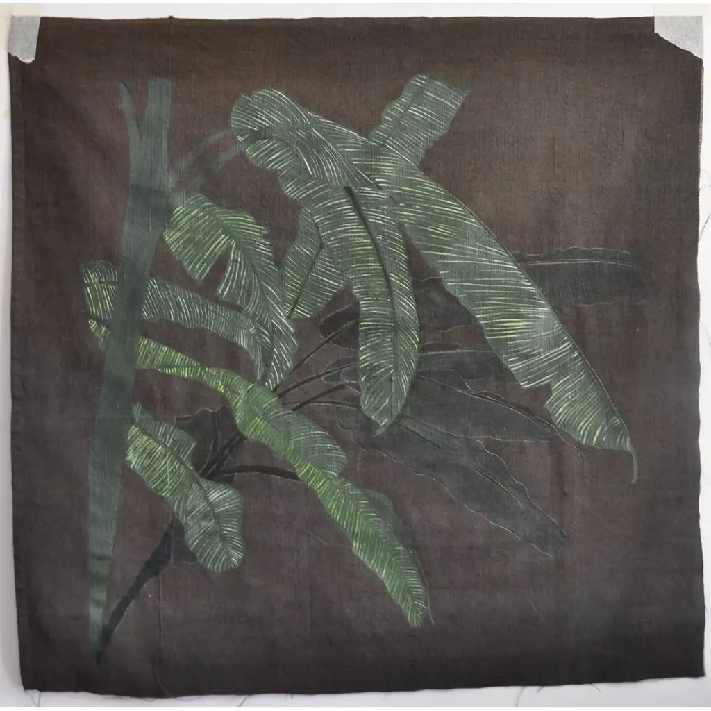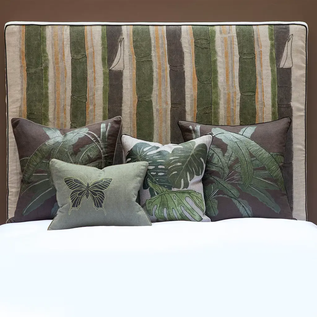 Banana Leaves cushion is part of the Giardino collection. Finely hand painted and embroidered on Linen. Velvet piping. Silk lining. Back of the cushion can be in different material. Limited edition. Giardino is a collection inspired by the beauty and grace of flowers. The spirit of the collection is to create a blend between images from Italian countryside and British gardens. Flowers, plants, leaves are reinvented and interpreted in a modern and creative way.