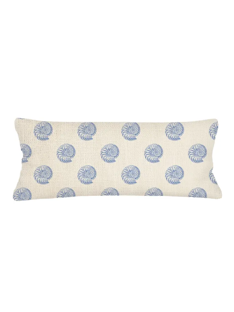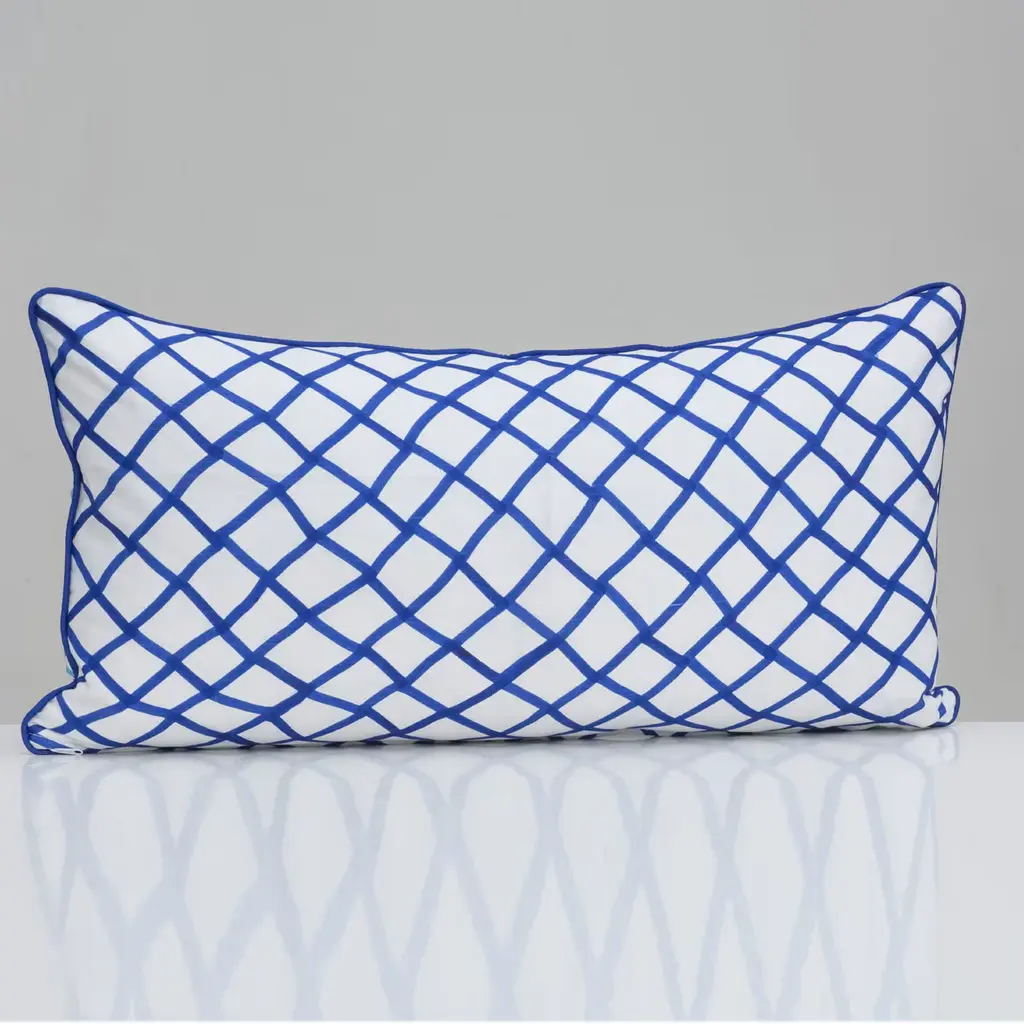 This striking cushion has a down insert with a cover in linen decorated with a two-tone blue and white fish over a turquoise net that runs for half of the front of the cover and in the back. The edge of the cushion is also elegantly painted in dark blue.