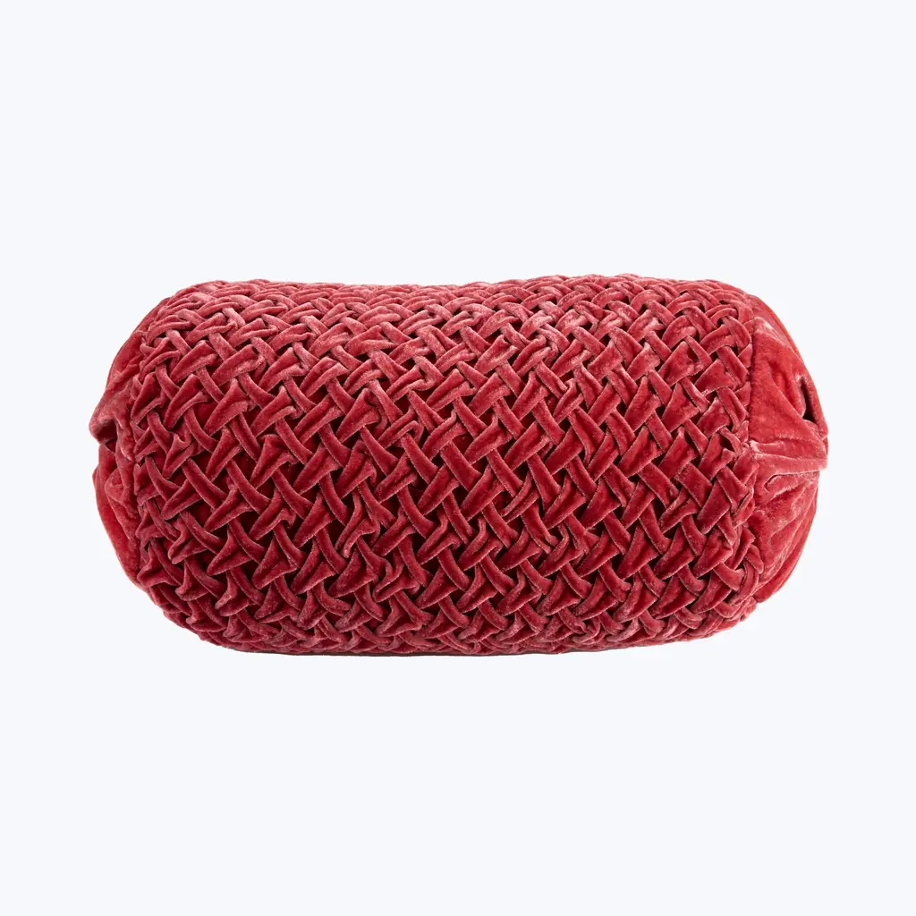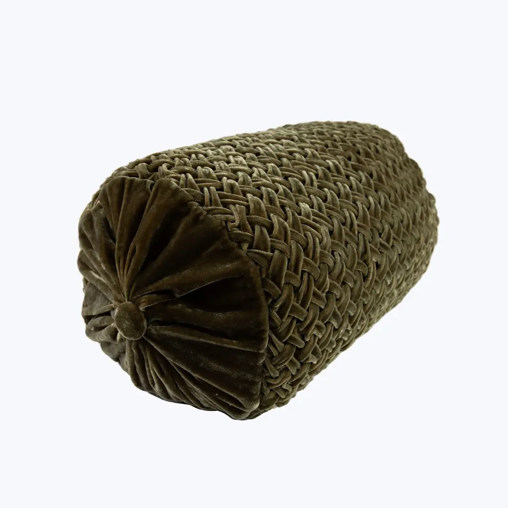 The Basket Weave Silk Velvet Bolster Pillow is a circular decorative pillow from India. It features a 3-d basket weave design in peridot green, deep olive and bright watermelon shades crafted from 100% Silk Velvet. The pillow has a plush and soft texture, adding an elegant touch to any couch, chair, or bed.