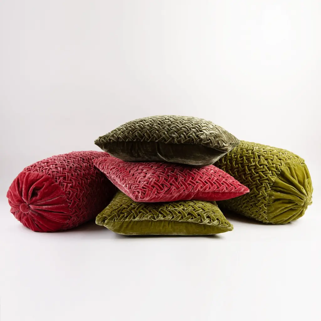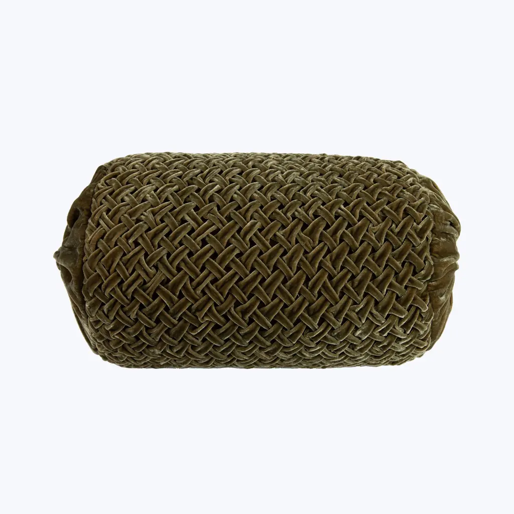 The Basket Weave Silk Velvet Bolster Pillow is a circular decorative pillow from India. It features a 3-d basket weave design in peridot green, deep olive and bright watermelon shades crafted from 100% Silk Velvet. The pillow has a plush and soft texture, adding an elegant touch to any couch, chair, or bed.