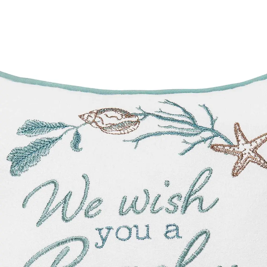 Unleash beachy vibes during this sandy holiday season at the shores with our festive embroidered Beachy Christmas Pillow. Enjoy the classic phrase of We Wish You a Merry Christmas with a coastal twist, surrounded by seashells and coral against a white background, accented in coastal blues and tans. Onward, seaside Christmas!