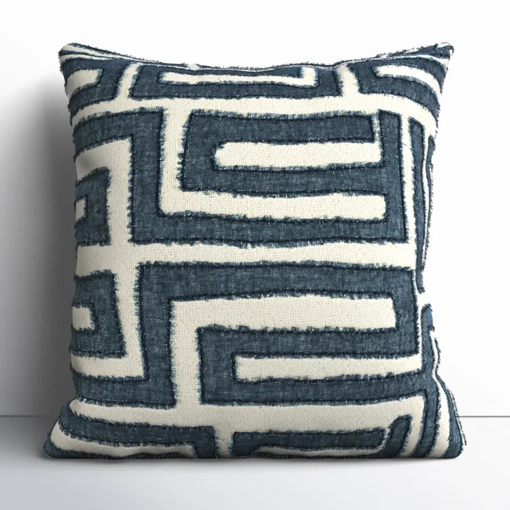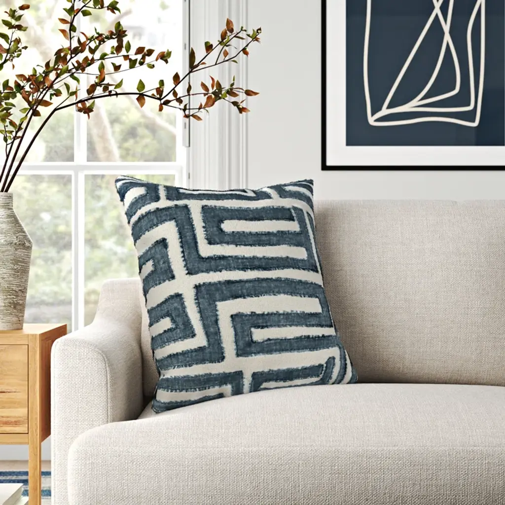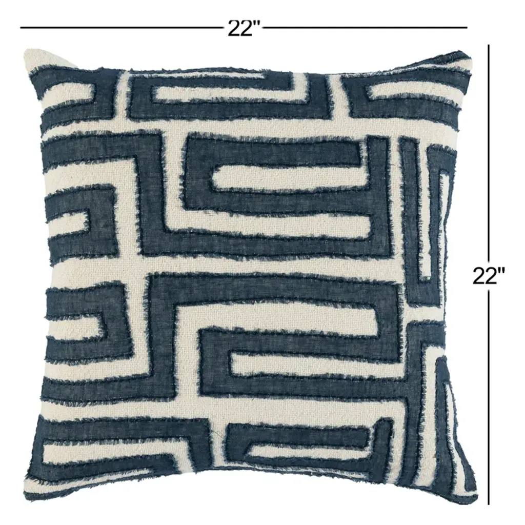 A hand-applied applique gives this pillow a bold, geometric look while adding texture and rich color to your space. The deep blue or natural tone pops against the ivory background to create a versatile look that suits a variety of styles from classic to modern. Filled with a down blend, this pillow offers plush comfort without sacrificing eye-catching style.