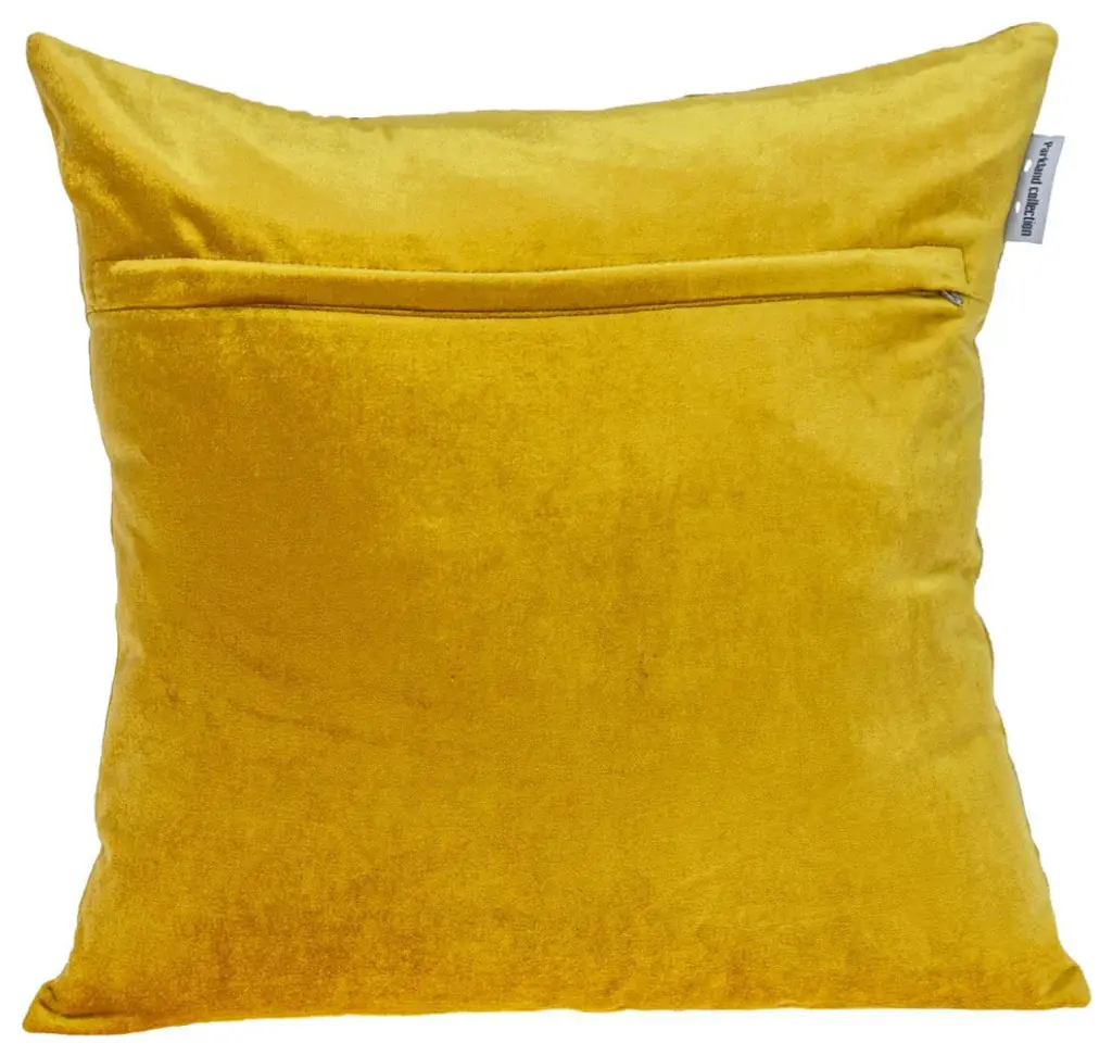 A vision to behold the Beige and Mustard Yellow Velvet Lattice Throw Pillow is as striking as it appears. Fabricated from pure velvet, classic ethnic patterns sit stylishly on a gold blanket accentuating the luxuriousness of this eye-catching pillow. A hidden zipper on the solid yellow back plain surface attributes to easy removal and reinsertion of the cushion. Bunch them up together or individually style them for your accent chairs and sofas, this throw pillow portrays a rich opulent look that is ideal for a variety of spaces. 18" x 18" x 4"