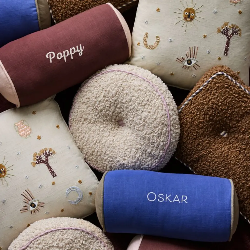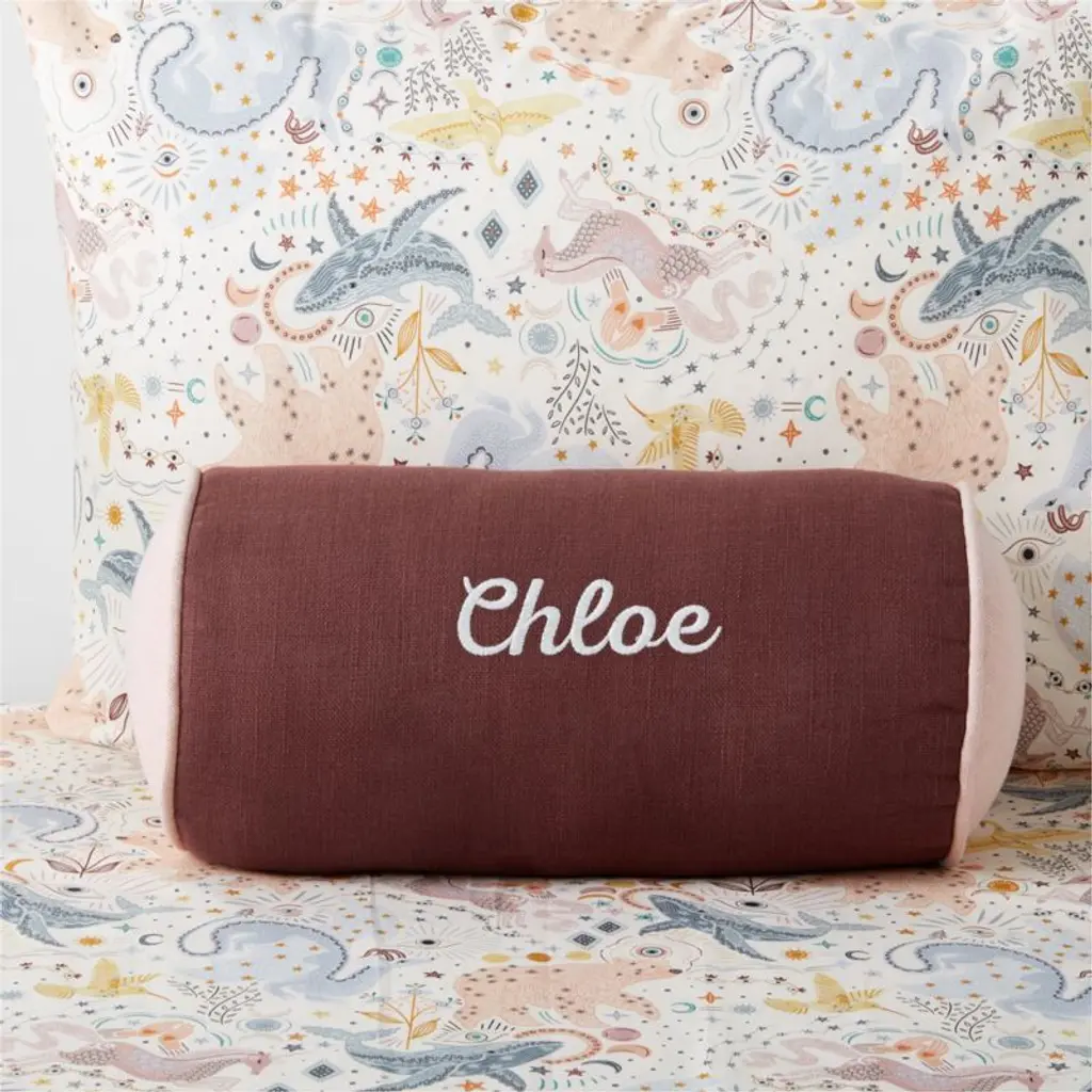 Give a bed or seat an extra boost of comfort, style and personality with our Belfast Bolster Throw Pillow by Jeremiah Brent. The organic cotton slub cover is colorblocked in a bold, sophisticated combo of chestnut red and soft rose, and it can be personalized with your child's name on the front.Our baby & kids collaboration with celebrated designer Jeremiah Brent is made to last: playfully sophisticated pieces designed for growing up.