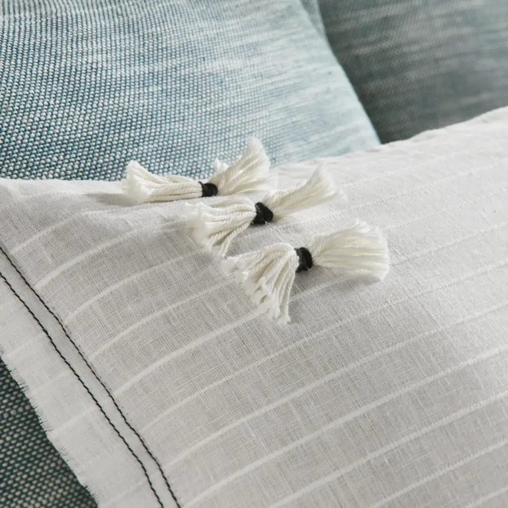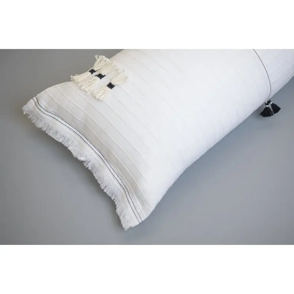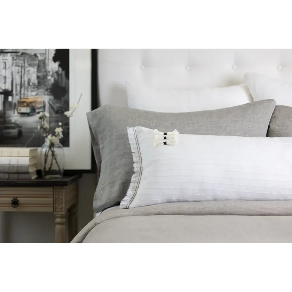 A new staple, this X Long Bolster to match our Bertin duvet cover is understated enough to be a solid, yet boasts a touch of interest as a subtle textural pin stripe is woven horizontally throughout. Small tassels add a dramatic contrast to subtle textured stripe.