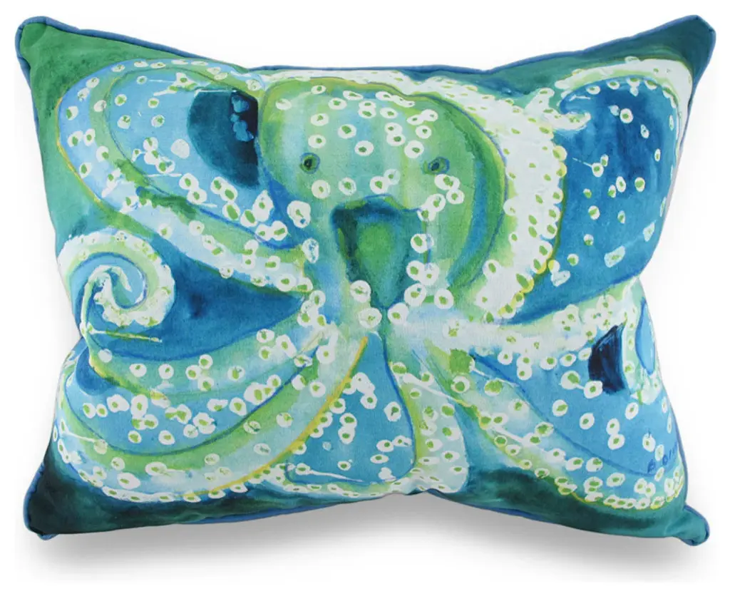 20 in. Long, 16 in. Wide, 4 in deep100% Polyester Cover/FillingAdds a Beautiful Pop of Color to RoomsEnjoy Indoors or OutRecommended to Spot Clean OnlyAdd a pop of aquatic charm with this throw pillow to accent your home inside or out in tropical style! With original artwork designed by artist Betsy Drake, a peppy blue and green octopus comes to life in water-color style on this artistic pillow that`s perfect for your living room sofa or the Adirondack chair on the patio and has a complementing blue backing and piping around the edges. The 100% polyester cover is water repellent and it`s filled with 100% polyester fiber. Measuring 20 inches long by 16 inches wide (51 cm by 41 cm), it would look amazing by a pool area, in the guest room or just tossed on the bed, and is made with pride in the U.S.A. It is recommended to spot clean only. This bright and cheerful throw pillow would make an excellent housewarming gift perfect for any tropical decor fans!