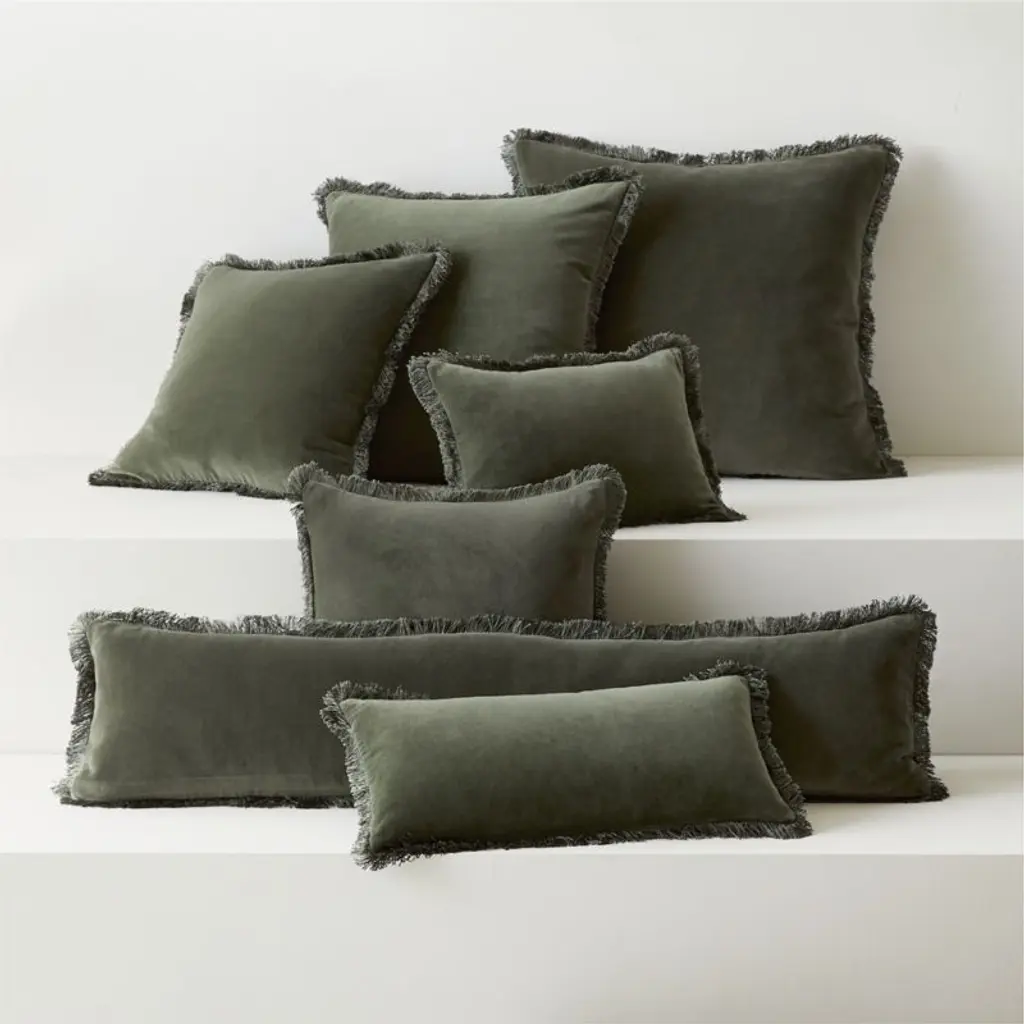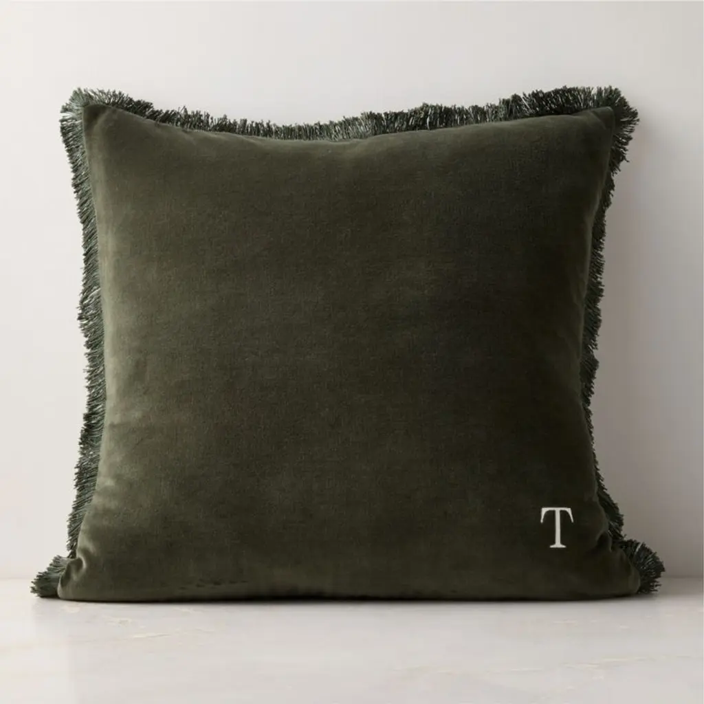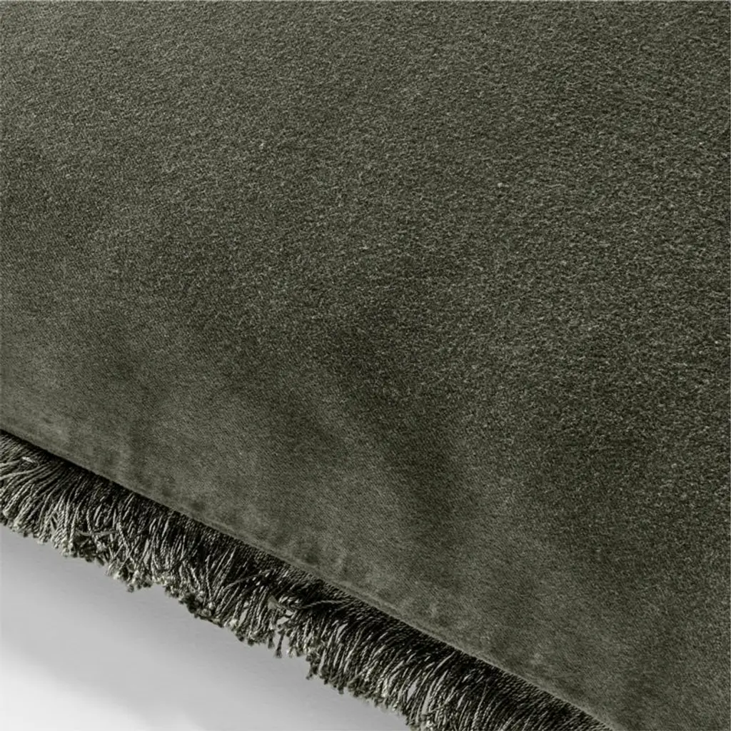 Luxurious forest green throw pillow embodies refinement and restraint. Woven from smooth organic cotton velvet, its plush surface offers a tactile richness that invites touch. Complementary tonal fringe looks polished and pulled together, while a discreet zipper closure ensures a seamless silhouette. CB2 pillows include a pillow insert in your choice of feather down or down alternative. CB2 exclusive.