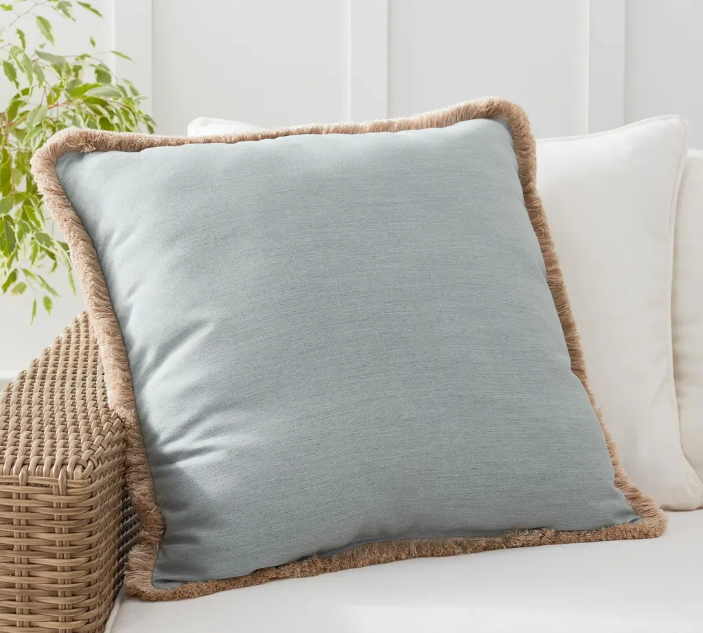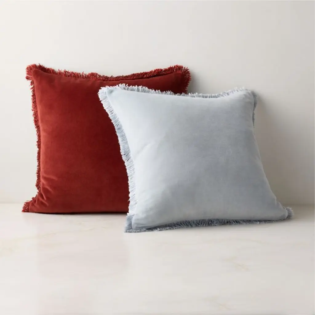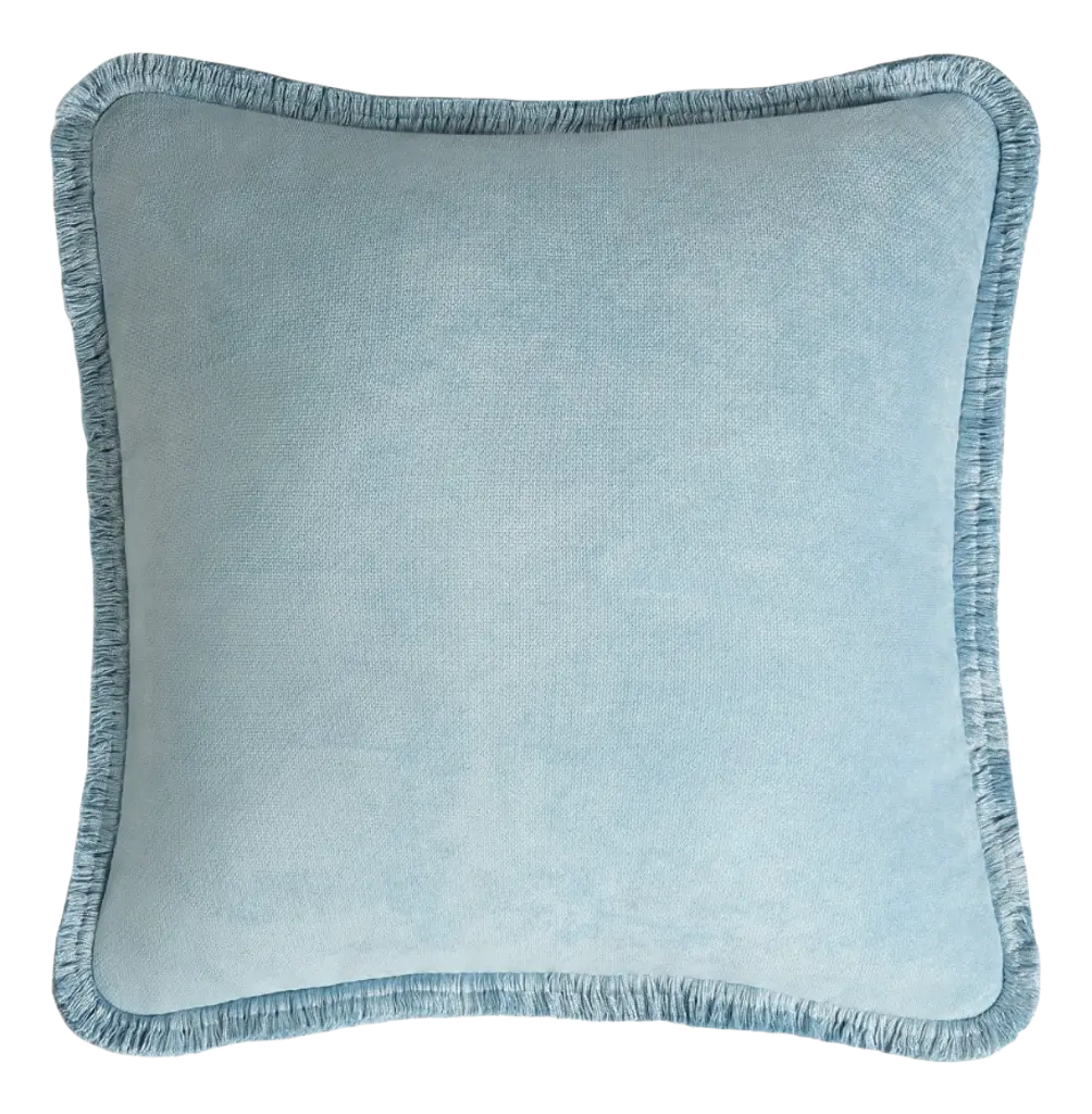Luxurious light blue throw pillow embodies refinement and restraint. Woven from smooth organic cotton velvet, its plush surface offers a tactile richness that invites touch. Complementary tonal fringe looks polished and pulled together, while a discreet zipper closure ensures a seamless silhouette. CB2 pillows include a pillow insert in your choice of feather down or down alternative. CB2 exclusive.