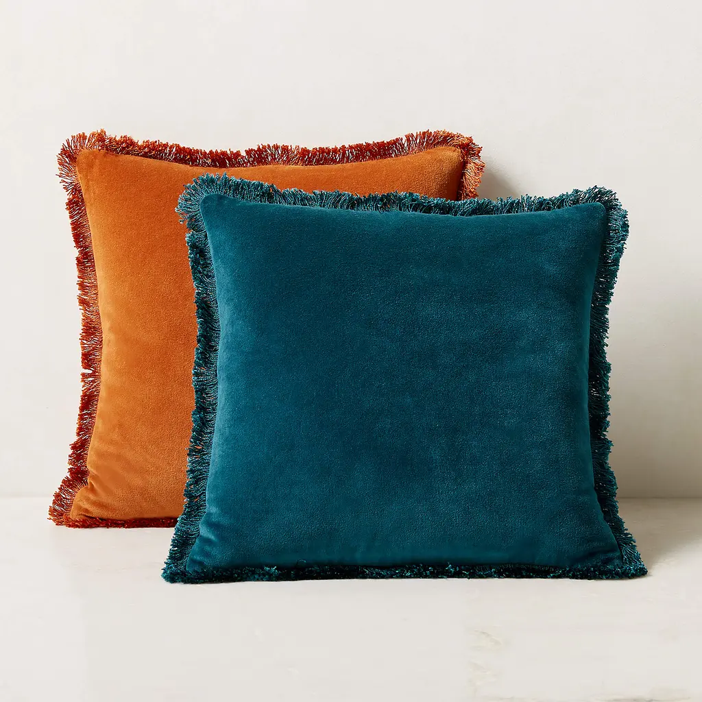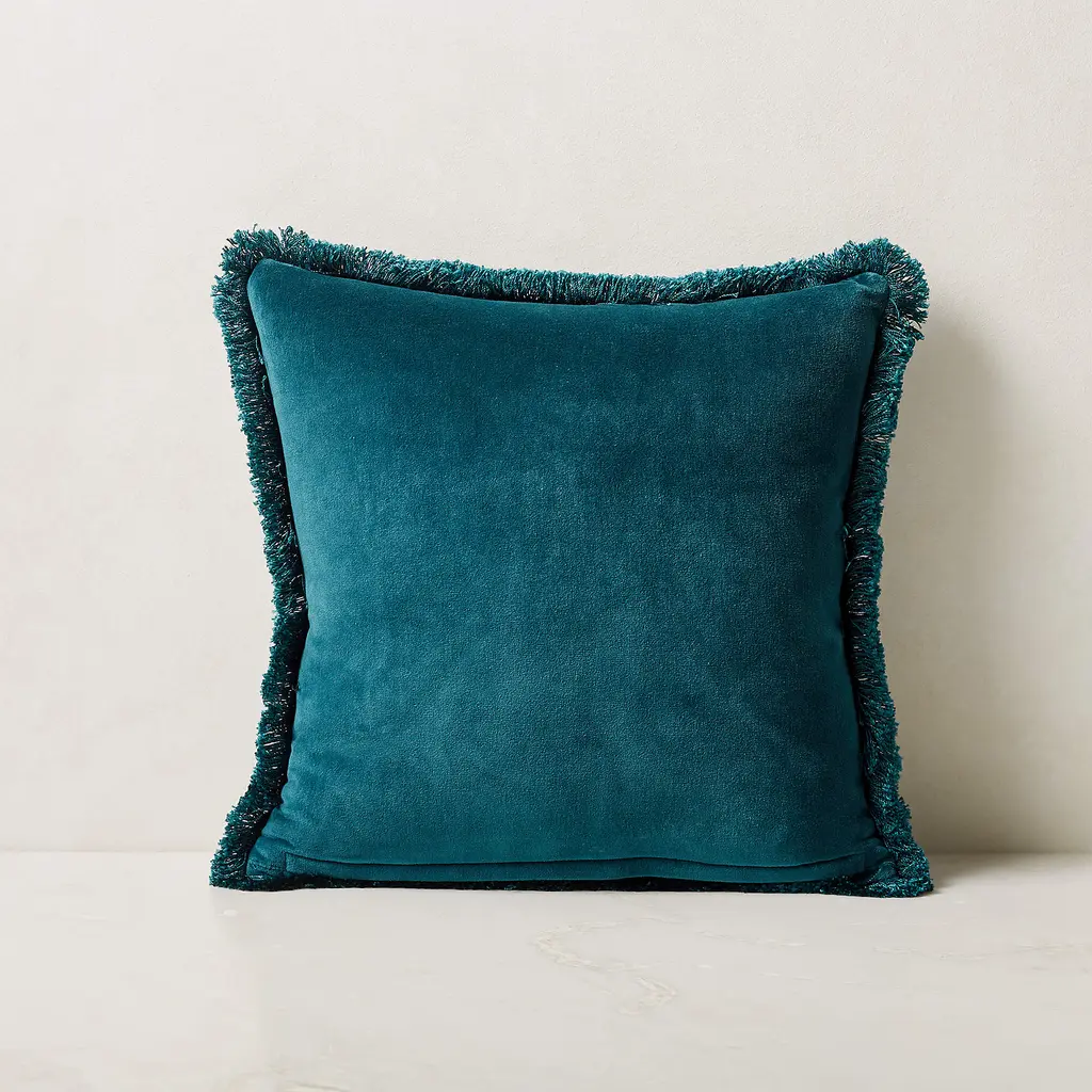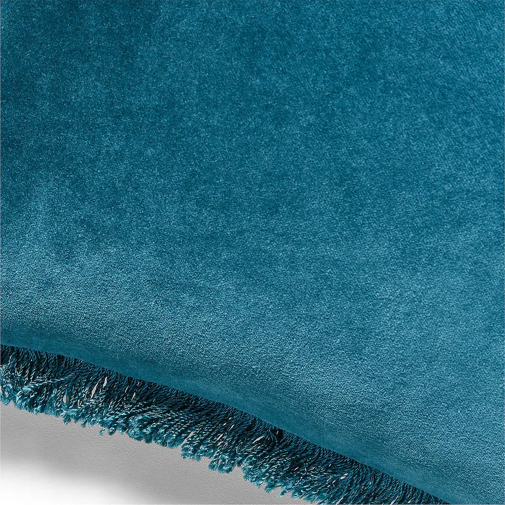 Rich tonal color is the secret to this seriously luxe throw pillow. Teal velvet is edged in a fringe of darker teal for a look that's polished and pulled together. CB2 pillows include a pillow insert in your choice of feather down or down alternative. CB2 exclusive.