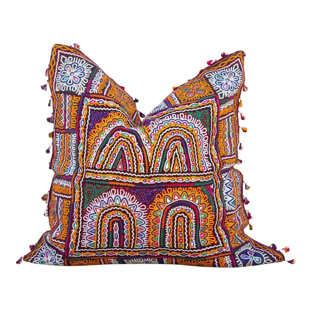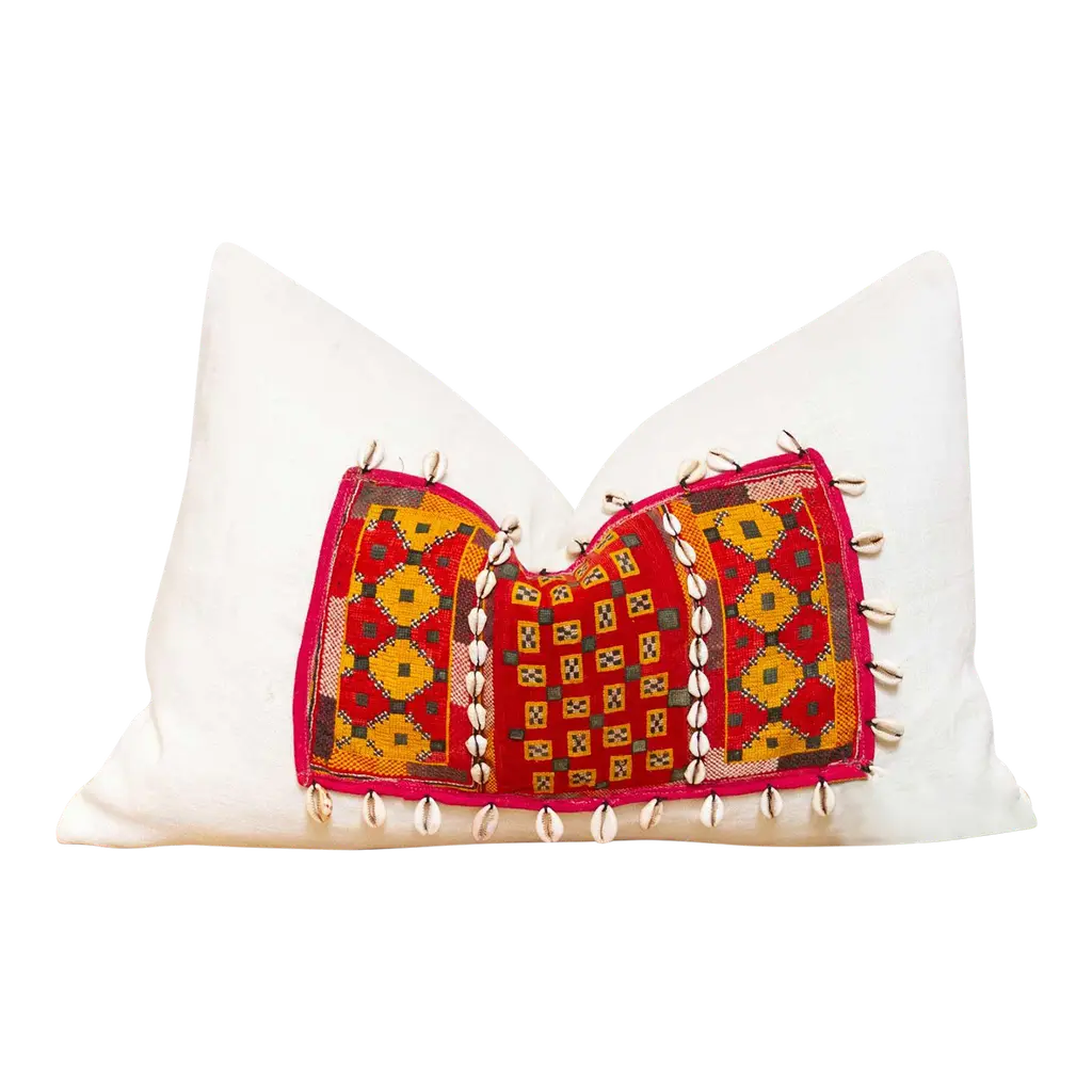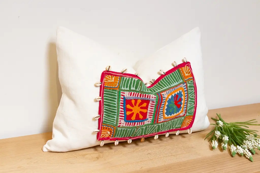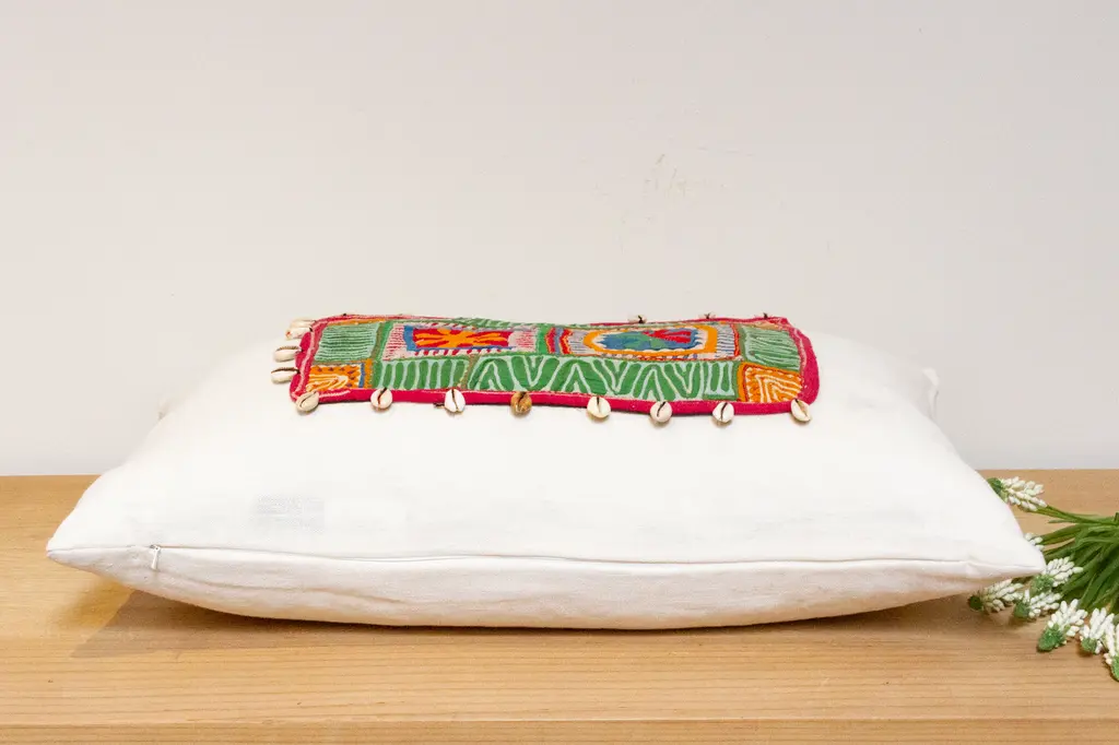 Crafted using antique Jumlo tribe embroidered fabric, these beautiful linen pillows are truly rich in culture and color. Each pillow wears a fragment from an embroidered turban or sash worn by bridegrooms in Haripur, Hazara district. Nestled in the foothills of the Himalayas, Haripur is renowned for its diverse tribal communities, each with their own unique embroidery traditions.