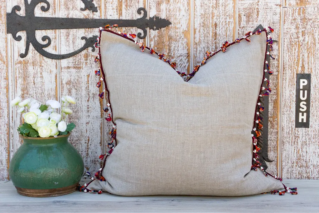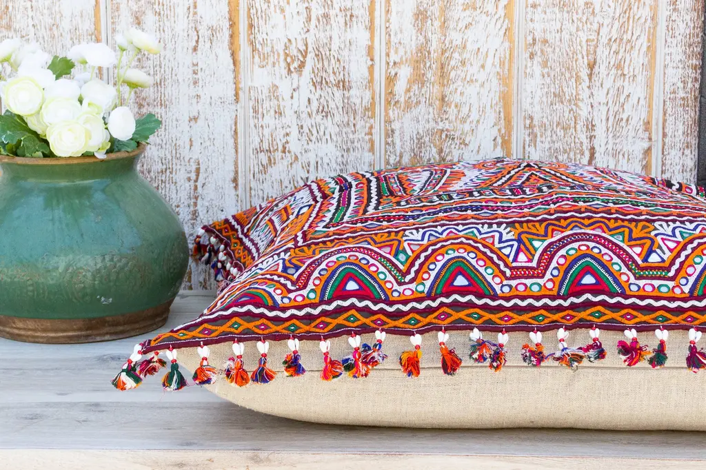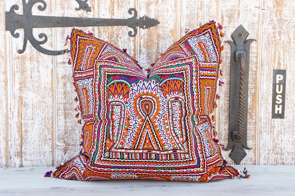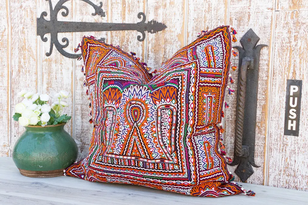This embroidered decorative pillow cover comes from the Meher pastoralists of Upper Sind, where the Meher are probably the finest domestic embroiderers in the whole subcontinent. Embellished with sisha mirror-work and couched threads with beautiful tribal patterns, this pillow also wears a natural linen back and a zipper enclosure.