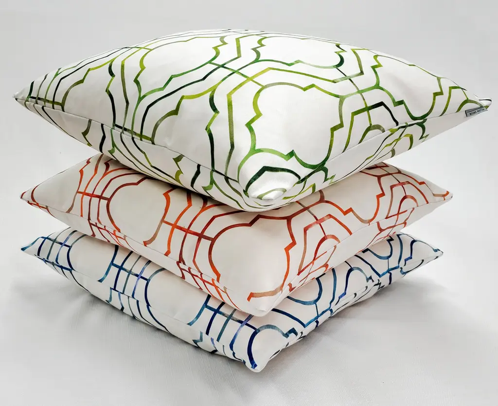 The 20 inch square Biltmore Gate Throw Pillow in green is a 100% cotton pillow with a lattice pattern on front and back. The lines of the lattice are printed in a watercolor style, incorporating various shades of green that bleed together, giving the pillow a soft yet lively, fresh look. Size: 20''x20'' Square Fabric: 100% Cotton Same fabric and design on front and back Knife edge seams. Inside seams are serged for strength and durability. Hidden zipper closure in bottom seam of pillow cover Dry cleaning is recommended, or machine wash separately in cold water on delicate cycle. Lay flat to dry, iron inside out on low heat. Made in Canada: Designed and made in Pillow Decor's Vancouver workroom.