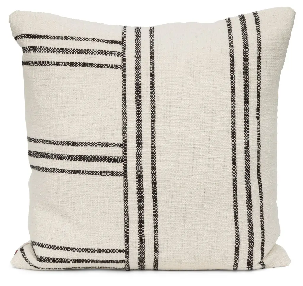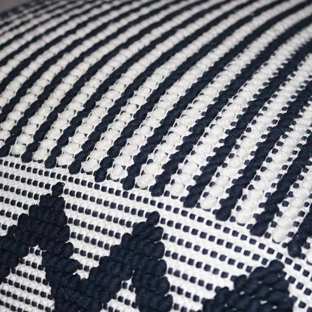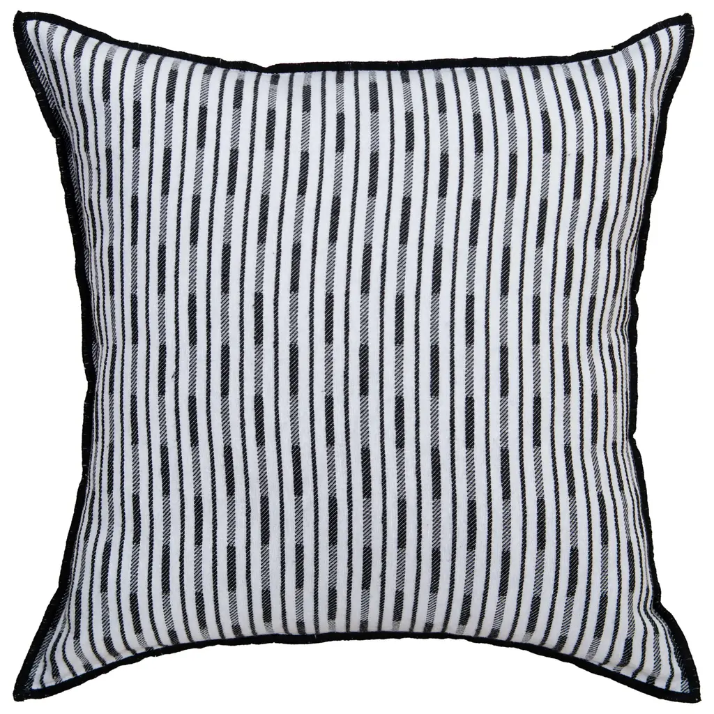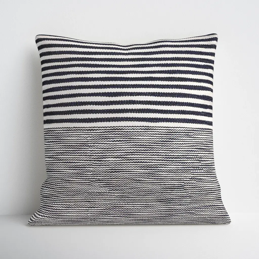 Unrivaled weaving mastery and elegant geometric patterns distinguish this refined cotton cushion, a superb synthesis of tradition and modern sensibility. Its peculiar textured quality is achieved through the creation of hand-woven stitches resembling tiny grapes, called "pibiones" in Sardinian dialect and naming the eponymous technique. A zig-zagged detailing accents one side, offering a twist to the striped design characterizing the rest of the cover.