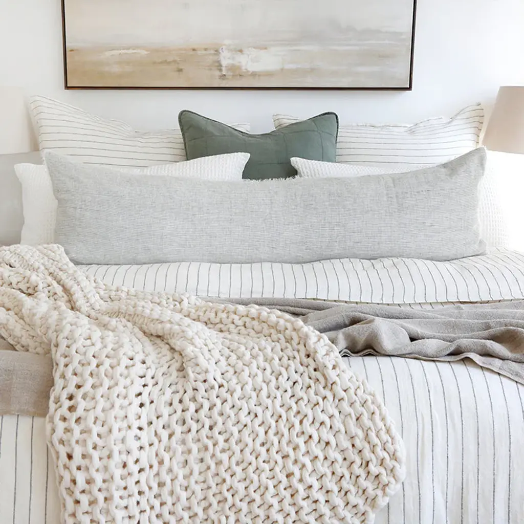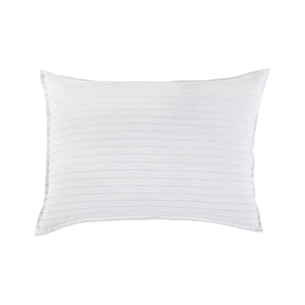 Introduce a luxurious accent to your living space with the Blake Big Pillow With Insert from Pom Pom At Home. Expertly hand-loomed with a dark interwoven stripe, this piece offers a modern and sophisticated take on the classic stripe. Perfect for coastal, farmhouse, and even contemporary spaces, elevate your decor with this exclusive and elegant addition. Highlights