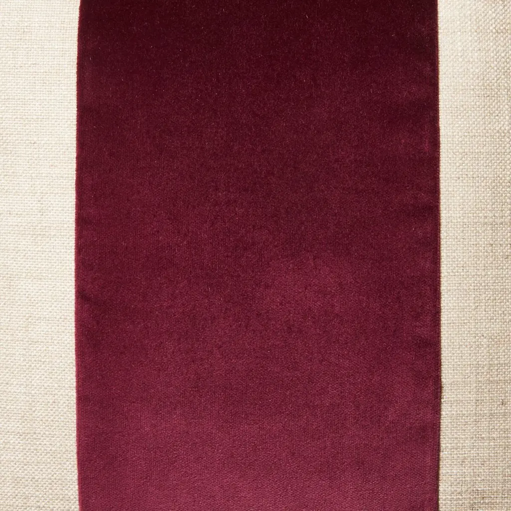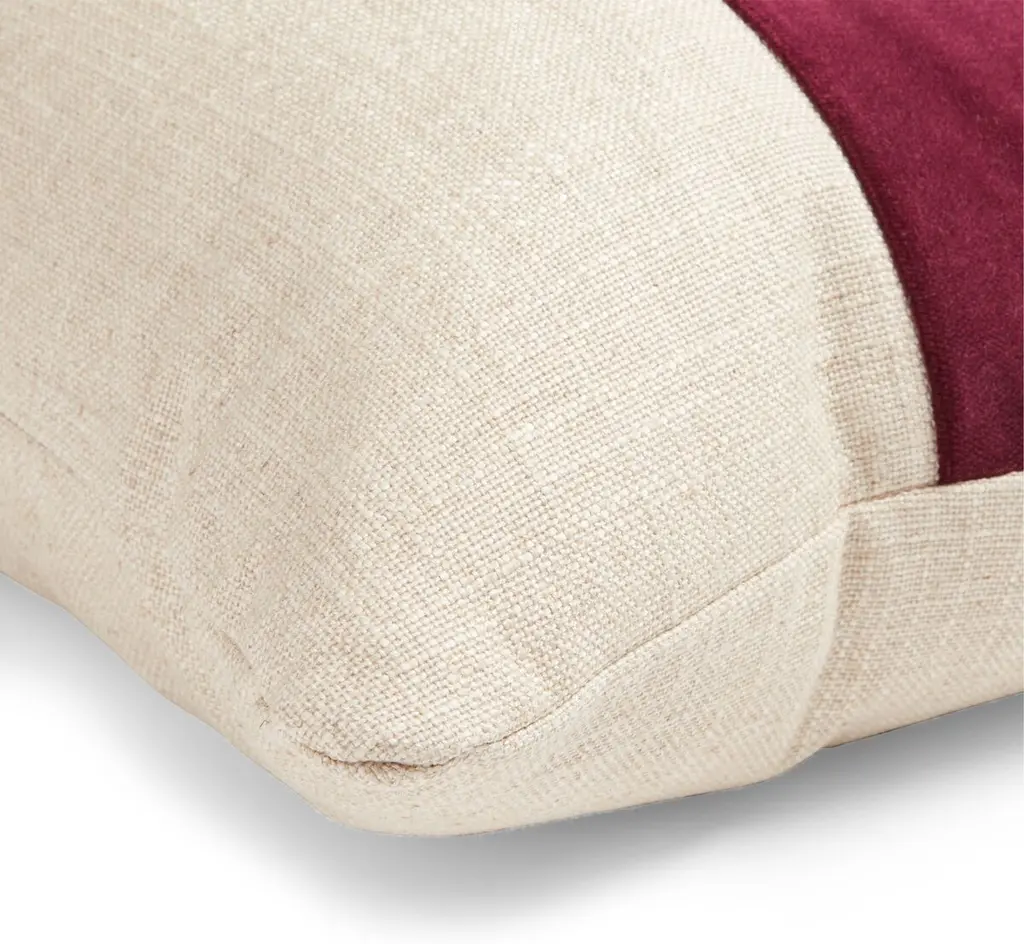 Designed by us and available only at One Kings Lane: A classic accent for any sofa, bed, or chair, this pillow is made of natural linen-blend fabric with a wine-hued velvet stripe down the center and knife edges. Solid back. Insert included. Zipper closure.