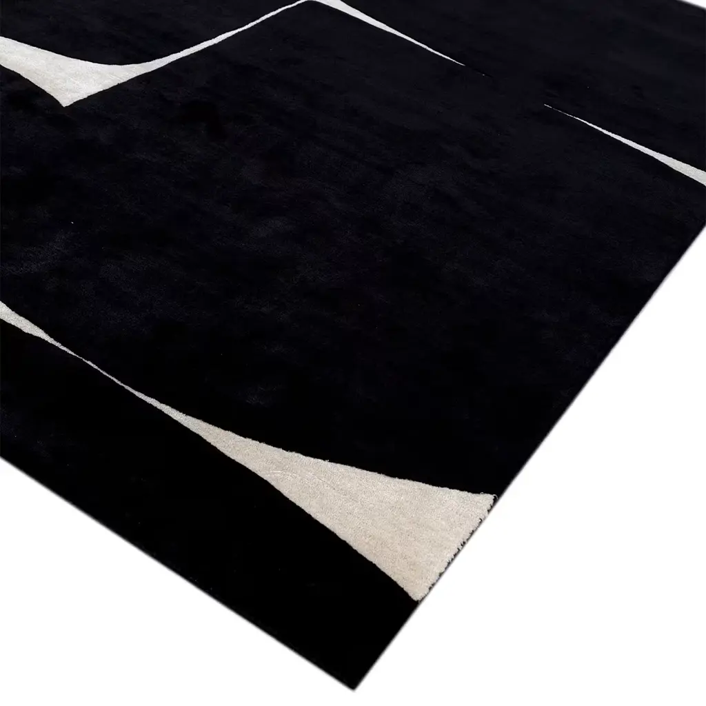 This hand-tufted area rug showcases minimalist design and exceptional craftsmanship. Made from a luxurious blend of 60% wool, 20% cotton, and 20% viscose, it features an elegant ebony and orange-rust color palette. The abstract pattern contrasts bold black shapes with delicate white lines, creating a dynamic yet serene visual. A touch of orange-rust adds warmth to the design. Ideal for contemporary, minimalist, and Scandinavian interiors, this rug is available in various colors, shapes, and size.