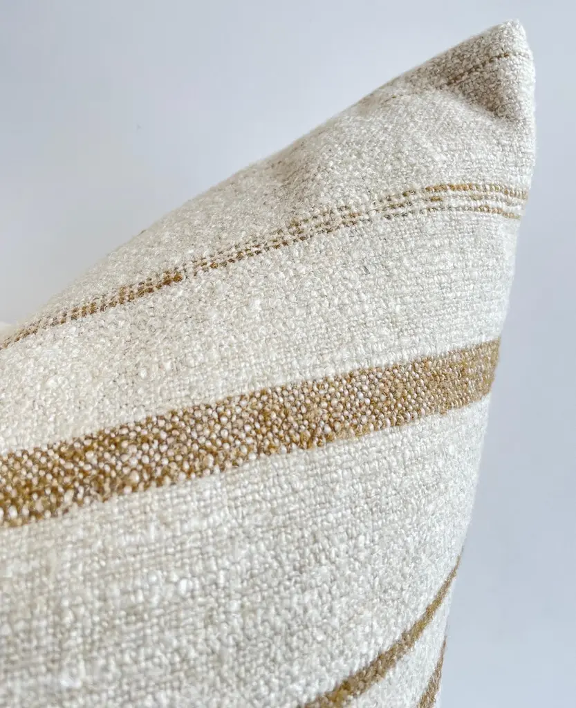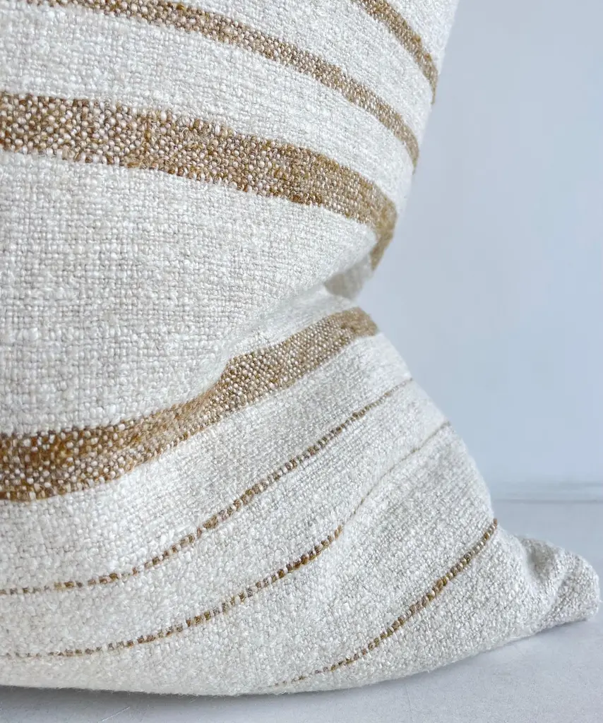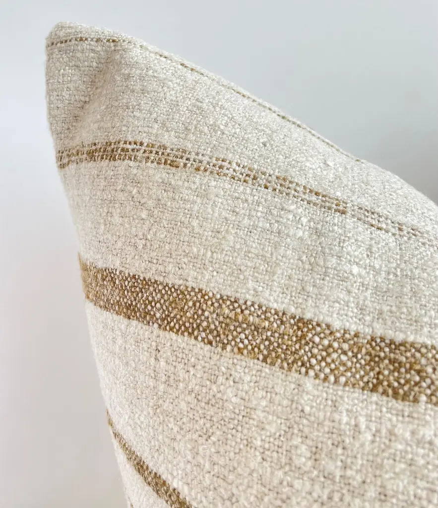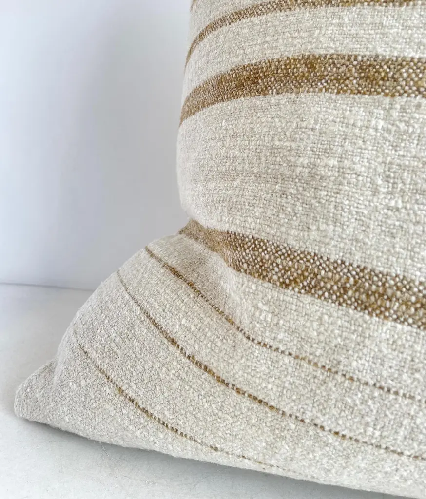 Woven in Belgium using traditional weaving techniques, Bloom Home Inc. Natalie features a Belgian Linen warp and alternating Belgian Linen/Mixed Fiber weft. This pillow feature a horizontal non repeating stripe. Includes insert. Color: Natural and Safran Content: Viscose 42%. Linen 34%. Acrylic 20%. Coton 3%. Polyester 2%. Nylon 2%Size: 23” x 23”.