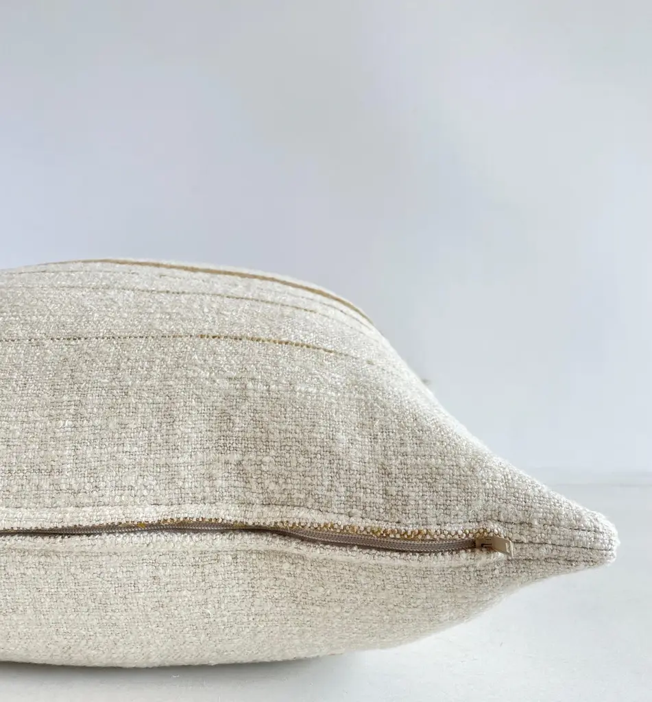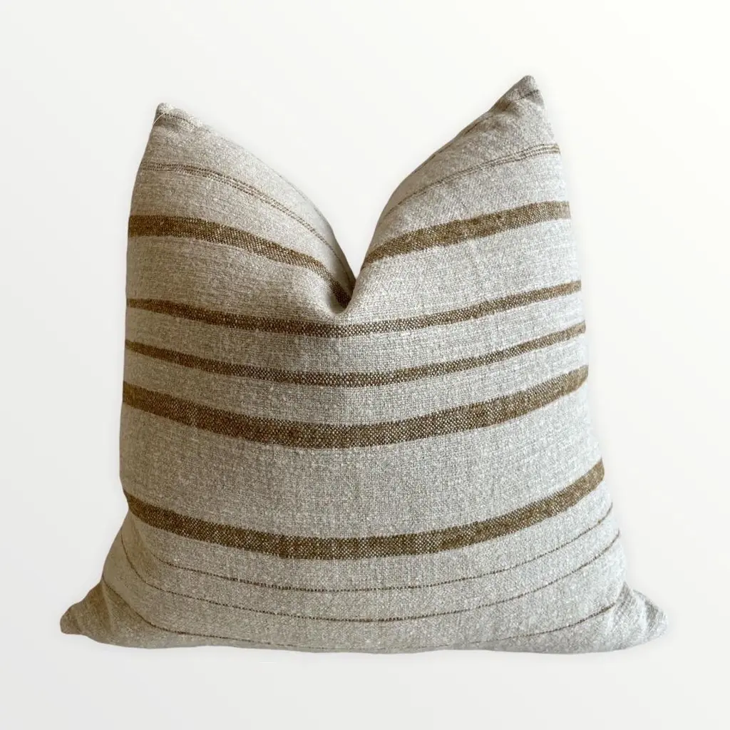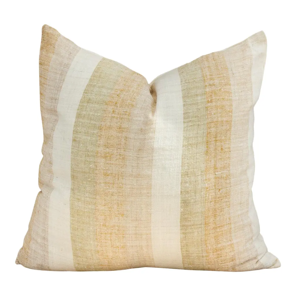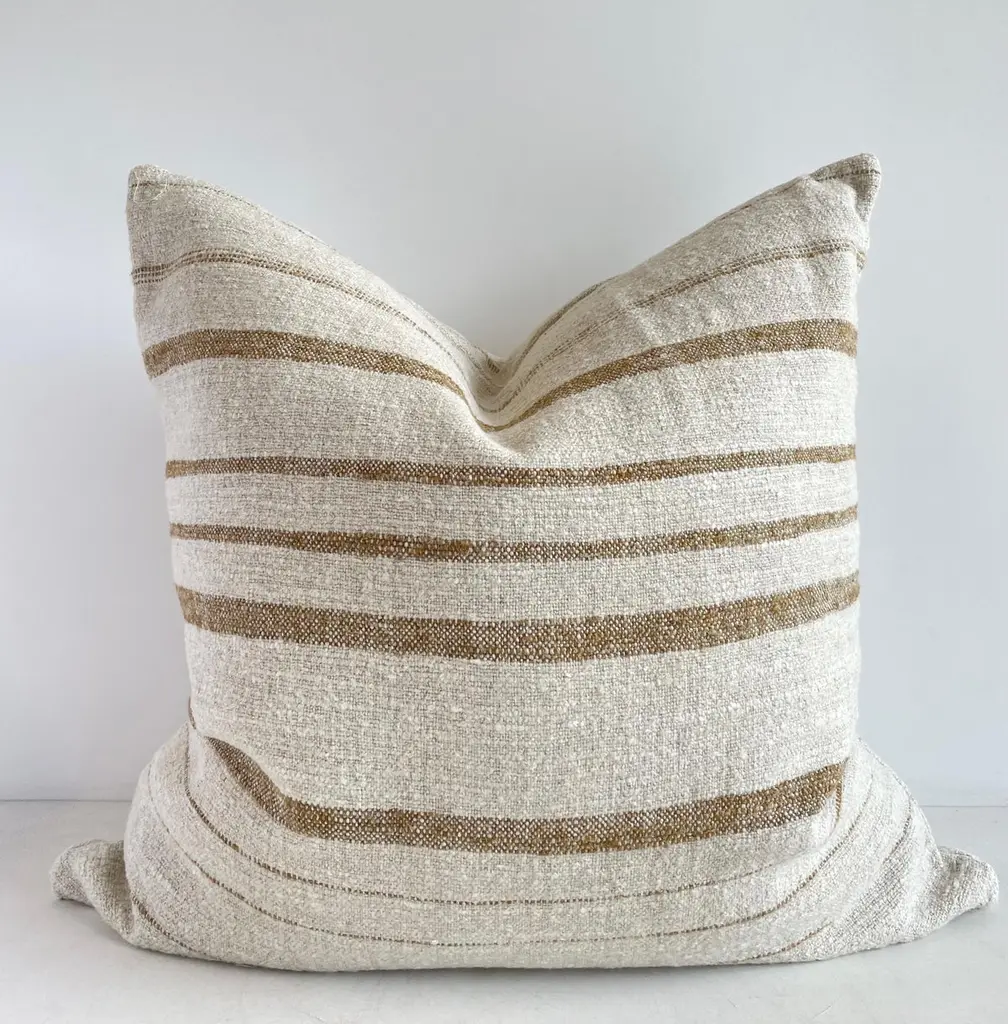 Woven in Belgium using traditional weaving techniques, Bloom Home Inc. Natalie features a Belgian Linen warp and alternating Belgian Linen/Mixed Fiber weft. This pillow feature a horizontal non repeating stripe. Includes insert. Color: Natural and Safran Content: Viscose 42%. Linen 34%. Acrylic 20%. Coton 3%. Polyester 2%. Nylon 2%Size: 23” x 23”.